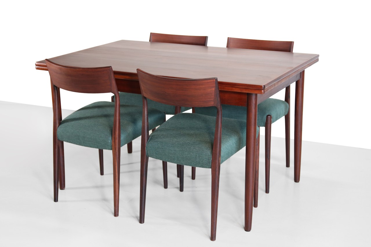 Omschrijving: Een zeer mooie set van vijf vintage Deense design stoelen, ontworpen door N.O Moller in de jaren 60. Deze set is opnieuw gestoffeerd in een groene exclusieve wollen meubelstof van het Deense merk Gabriel Mood, welke prachtig kleurt met het donkere palissander. Deze set van 5 is perfect geschikt voor mensen die nog een kinderstoel aan tafel nodig hebben. De stoelen hebben een perfecte zithouding en zijn gemaakt van Brazilian rosewood, een beschermde houtsoort die niet meer gekapt mag worden. Het vakmanschap is ongeëvenaard met organische rondingen en veel aandacht voor detail. We hebben een palissander tafel beschikbaar die erg mooi gecombineerd kan worden met deze set. De stoelen hebben een totale hoogte van 77, zijn 48 cm breed en 45 cm diep en hebben een zithoogte van 47 cm.