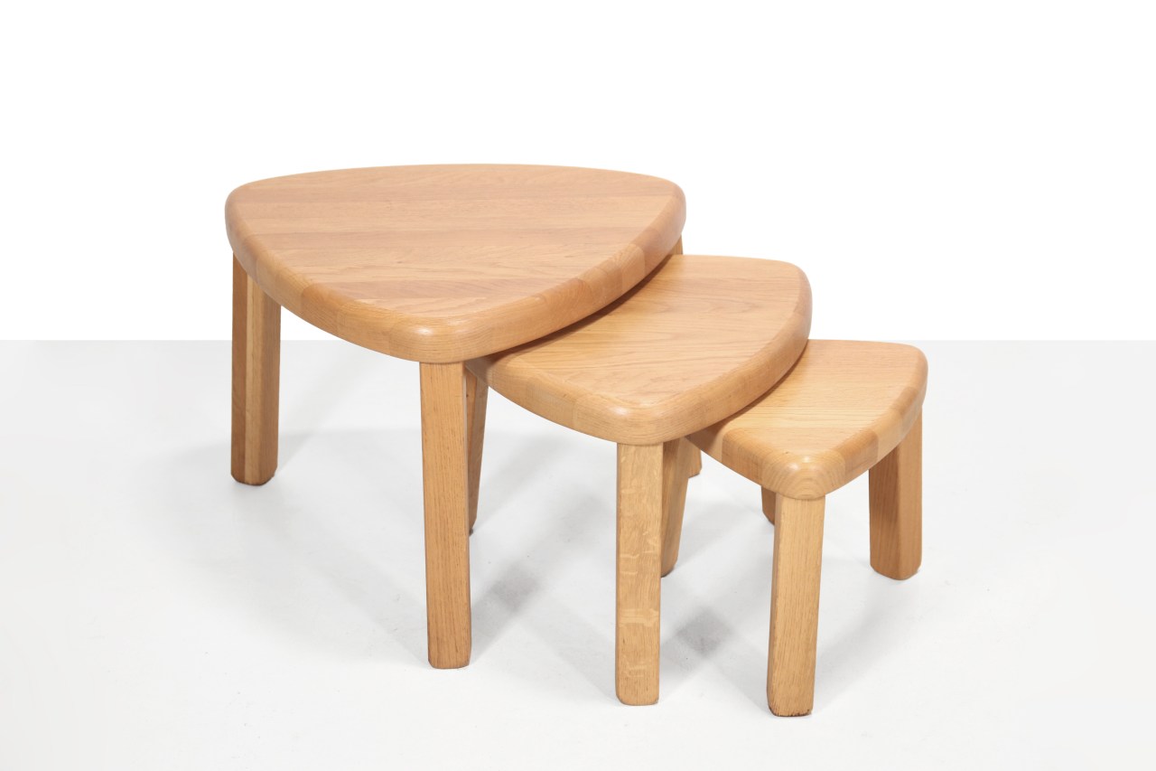 Omschrijving: Mooie set van drie massief eiken tafeltjes in een driehoekige vorm. Deze brutalistische set kan handig onder elkaar geschoven worden zodat ze niet te veel ruimte innemen. Ze kunnen ook in een groepje geplaatst worden om te fungeren als bijvoorbeeld salontafel. De grootste tafel is 45 cm breed bij 50 cm diep en heeft een hoogte van 39 cm. Het middelste tafeltje is 33 cm hoog en het kleinste tafeltje 28 cm.
