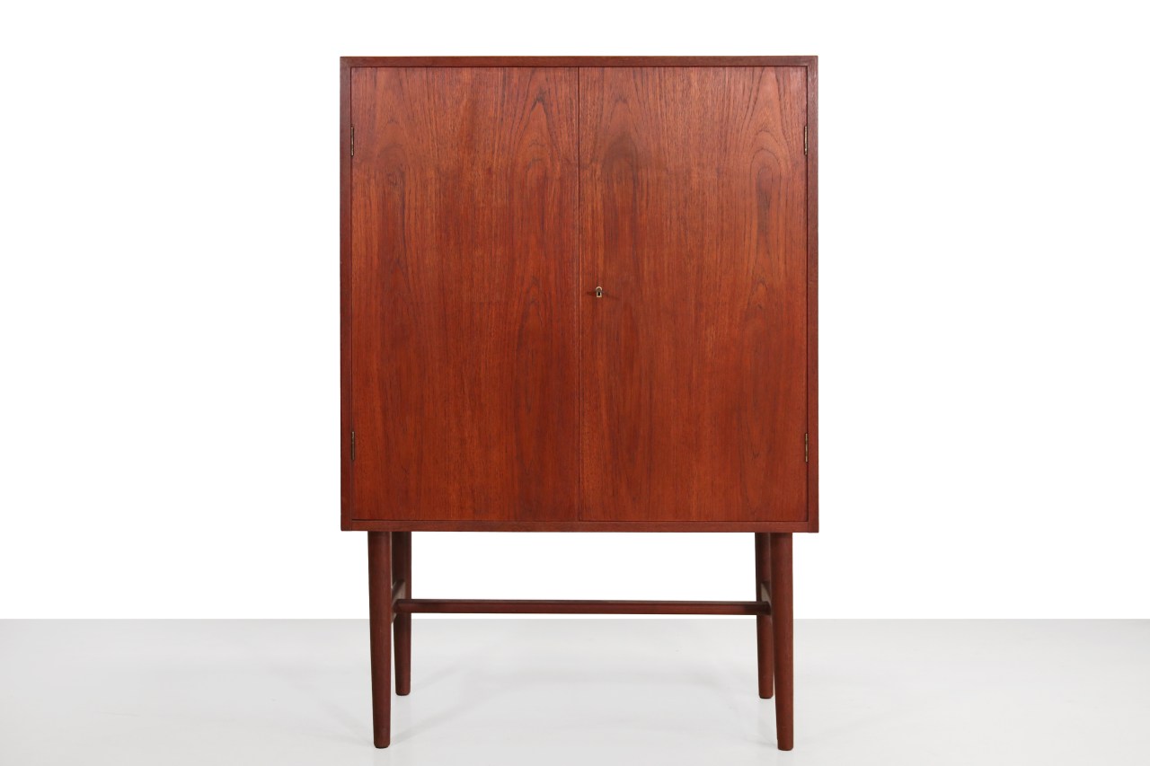 Omschrijving: Bijzonder cabinet specifiek gemaakt voor het opbergen van dranken en glazen. Deze kast is afkomstig uit Denemarken en is gemaakt in de jaren 60 van de vorige eeuw. Dit highboard is gemaakt van teakhout en heeft een berkenhouten interieur. In de kast is er plek om diverse glazen op te hangen, flessen neer te leggen, en er is een uitschuifbare plank gefineerd met formica om de drankjes op in te schenken. Ook beschikt de kast nog over twee lades en niet geheel onbelangrijk, een sleutel om de kast af te sluiten. De barkast is 85 cm breed en heeft een diepte van 45 cm. De kast is in totaal 124 cm hoog.