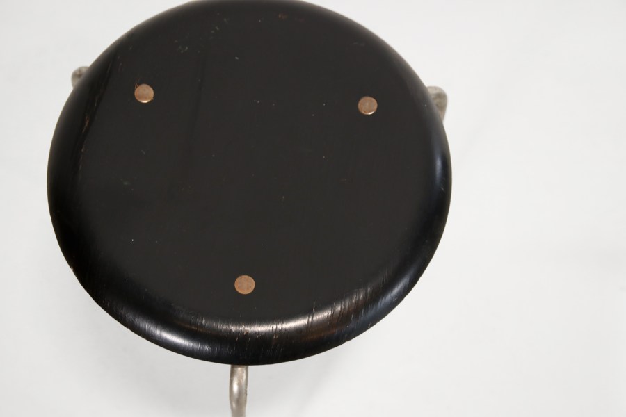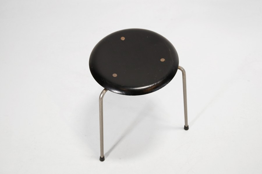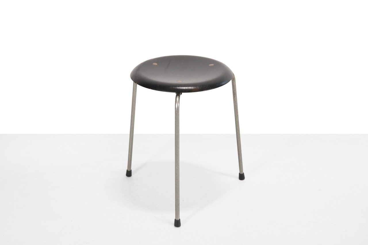 Omschrijving: Geweldige eerste productie Dot kruk van Arne Jacobsen voor Fritz Hansen. Samen met de kleinzoon van Fritz Hansen, Søren Hansen ontwikkelde Arne Jacobsen plywood meubels. Deze kruk was hun eerste samenwerking. Hoewel Arne Jacobsen de ontwerper is, was deze kruk er niet geweest zonder de hulp van Søren. De eerste versie van de kruk is te herkennen aan de messing doppen, waar de naam Dot vandaan komt, waar de zitting mee aan het onderstel bevestigd is. De zitting is gemaakt van zwart gelakt beuken plywood. De kruk heeft een diameter van 34 en een hoogte van 45 cm.