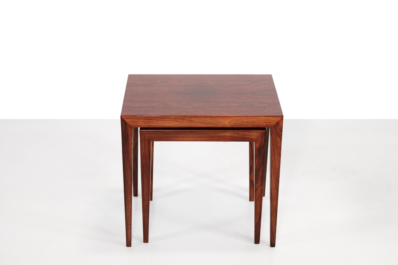 Omschrijving: Mooie set van twee bijzettafels van Severin Hansen voor Haslev Mobelfabrik. De set is gemaakt van Palissander en heeft prachtige details die de tafels bijzonder mooi maken. Simpel, maar heel stijlvol. De tafels passen onder elkaar en zijn handig om te gebruiken als bijzettafels, als salontafel, maar bijvoorbeeld ook als nacht tafeltjes naast het bed.