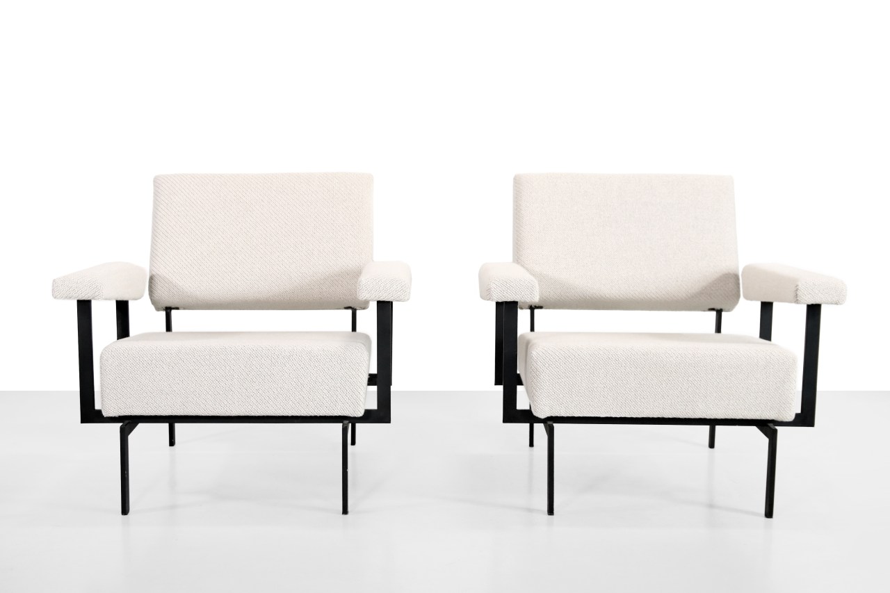 Omschrijving: Een paar prachtige Nederlands minimalistische design fauteuils ontworpen door Cees Braakman in het eind van de jaren 50 en geproduceerd door UMS Pastoe. Deze fauteuils zijn in de catalogi bekend onder modelnaam FM07. Deze stoelen zijn voorzien van nieuw schuim en ze zijn gestoffeerd met de hoogwaardige Kvadrat Coda meubelstof, wat een tweekleurige, driedimensionale wollen meubelstof is welke lijkt alsof het grof gebreid is. Hierdoor kun je weer jaren plezier hebben van deze twee design klassiekers. Elke fauteuil is 75 cm hoog, 75 cm breed en heeft een zithoogte van 40 cm.