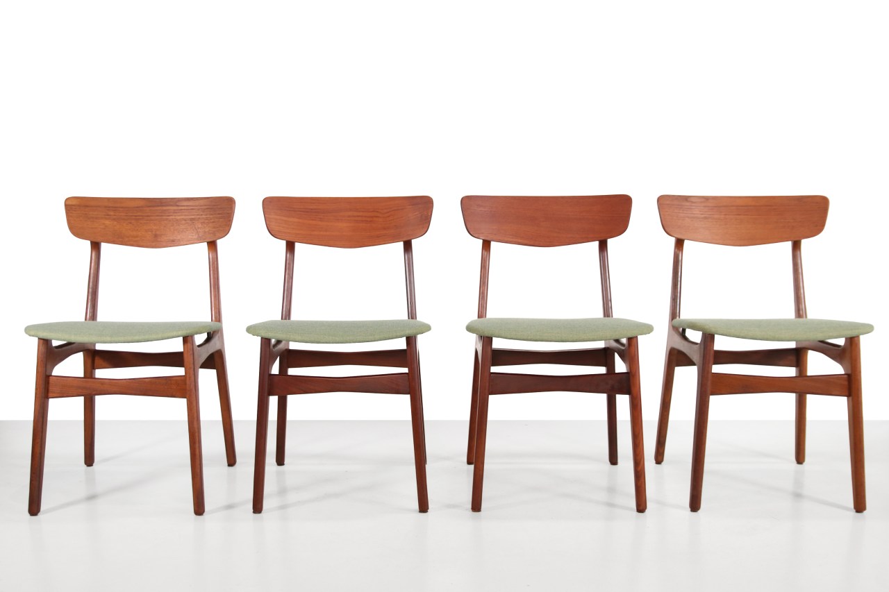 Omschrijving: Prachtige set van vier eetkamerstoelen met een organische vormgeving in het teakhouten frame en mooie details zoals de zwevende zitting door middel van messing afstand houders. De stoelen zijn ontworpen door Schønning en Elgaard, en geproduceerd door Randers Mobelfabriek in de jaren 60 in Denemarken. De zittingen zijn opnieuw gestoffeerd in een hoogwaardige Kvadrat remix 3 meubelstof met kleur 933. Een mooie gemêleerde groen die goed matcht met de kleur van het hout. De stoelen zijn 78 cm hoog, 48 cm breed en 50 cm diep en hebben een zithoogte van 46 cm.