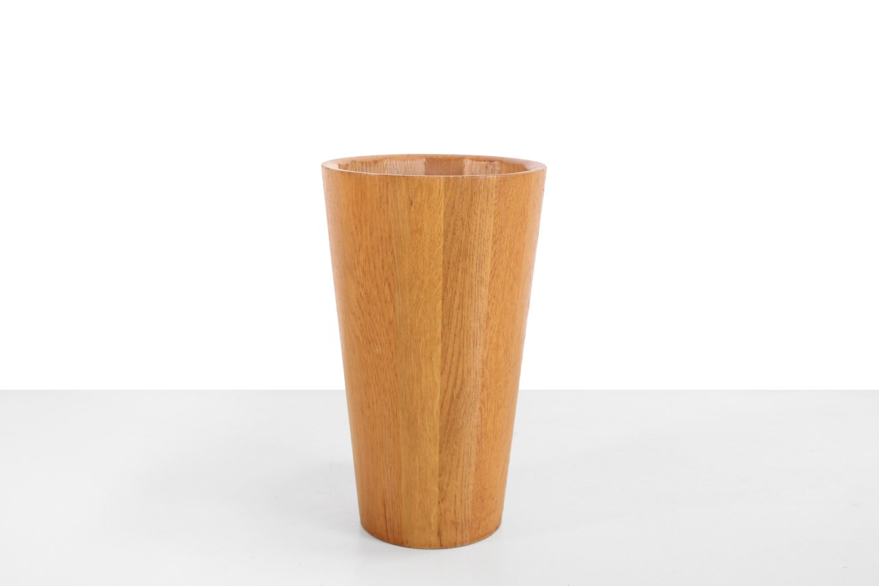 Omschrijving: Mid century massief eiken paraplubak of papierbak. Dit is een zeer bruikbaar vintage meubelstuk die elke hal of werkplek zal verfraaien. Het is in zeer goede stevige staat en meet 28 cm in diameter en 46,5cm hoog.