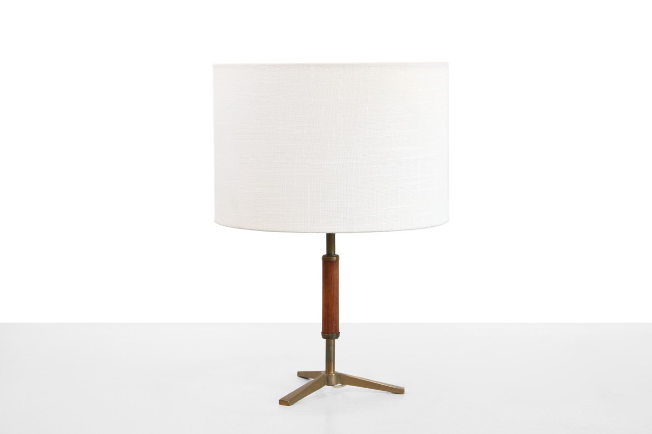 Omschrijving: Mooie tafellamp met Pallisander houten stang. Het lampje heeft een messing driepoot en is voorzien van een wit linnen kapje. Op de fitting is de lamp gemerkt met het logo van Asea Belysning uit Zweden. De lamp is in totaal 42,5 cm hoog en de kap heeft een diameter van 30 cm.