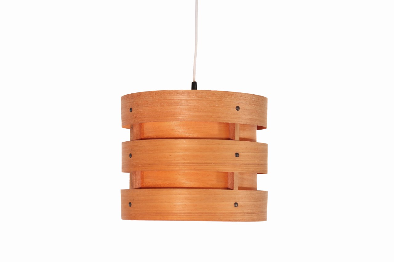 Omschrijving: Deze hanglamp is een ontwerp van Hans Agne Jakobsson. Geproduceerd door Ab Ellysett Markaryd in Zweden in de jaren 60. Hans Agne Jakobsson was een van de meest prominente Zweedse ontwerpers uit de jaren 50 en 60. Deze lamp is gemaakt van plywood fineer. Doordat het hout heel dun is kan deze gebogen worden in deze mooie ronde vorm en ook nog licht doorlaten. Door de houtstructuur en kleur van het dennenhout is het echt een warme lichtbron. De lamp is 25 cm hoog en heeft een diameter van 30 cm.