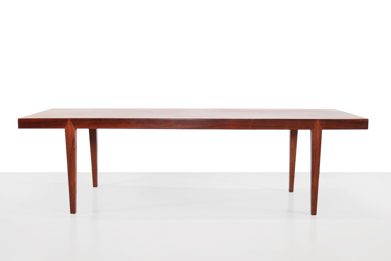 Omschrijving: Misschien wel de mooiste vintage salontafel van Deense ontwerper Severin Hansen voor Haslev Mobelfabrik, die hij gemaakt heeft. Deze tafel is gemaakt van palissander fineer en is zeer mooi en verfijnd afgewerkt. Vooral de prachtige verbinding met de tafelpoten maakt deze coffee table zo bijzonder. De tafel is 170 cm breed, 60 cm diep en 45 cm hoog.