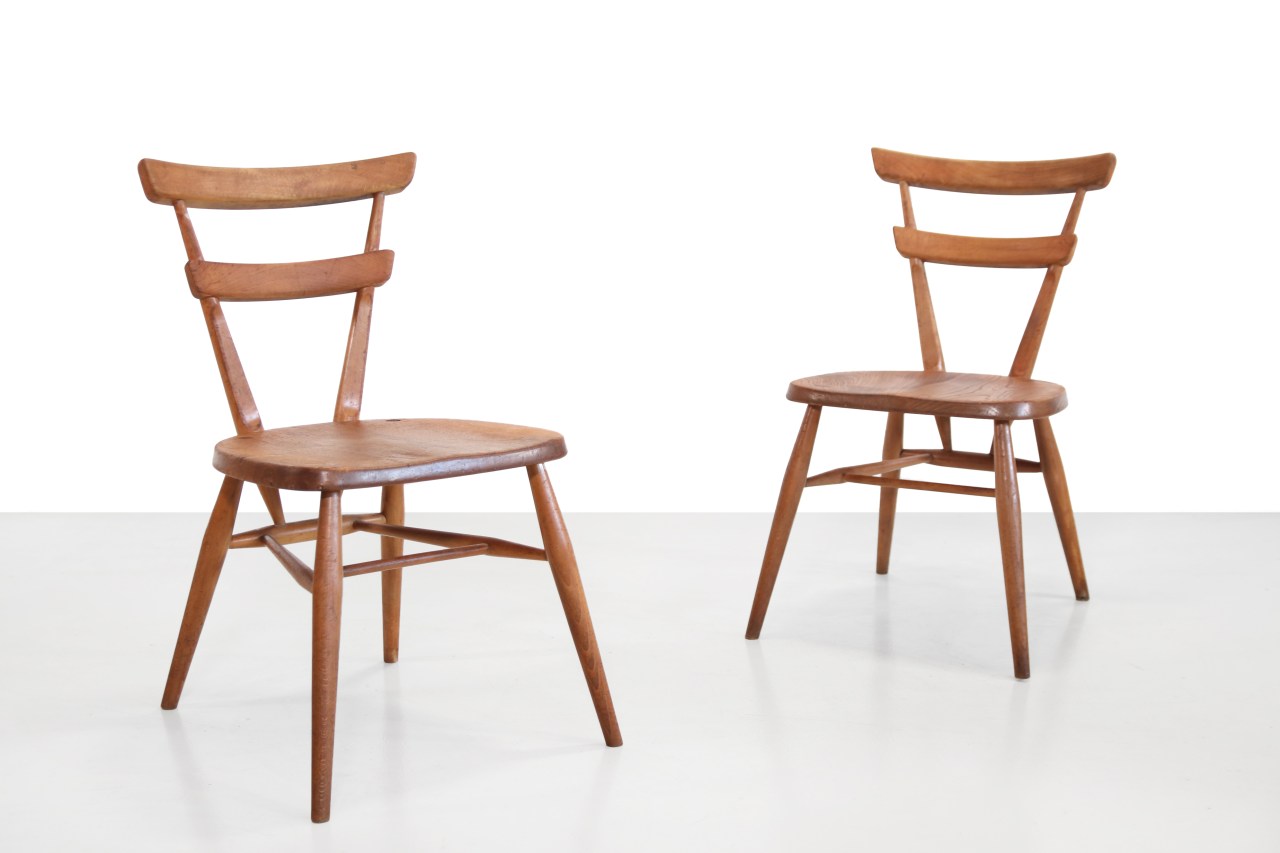 Omschrijving: Mooie set van twee stoelen ontworpen door de Italiaanse designer Lucian Randolph Ercolani en geproduceerd door zijn eigen bedrijf Ercol Furniture in de jaren 50. Wij vermoeden dat deze stoelen gekocht konden worden voor projectinrichting. Deze versie van zijn stoel is namelijk verstevigd met een extra spijl in de rug en voorzien van een blauwe stip. We hebben ze ook al eens met een oranje stip gezien. De kleur geeft het verschil in hoogte aan. De stoelen hebben een zeer uitgesproken vormgeving en maken het daardoor echte eyecatchers voor uw interieur. De stoelen zijn stapelbaar en in totaal 72 cm hoog, 44 cm breed en 50 cm diep. De zithoogte is 39 cm.