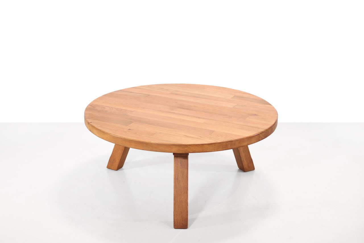 Omschrijving: Brutalistische ronde salontafel. Ambachtelijk gemaakt van massief eikenhout. De tafel staat op drie poten en is gemaakt door Meubelfabriek Oisterwijk. Deze fabrikant staat bekend om kwalitatieve Nederlandse Ambacht. De tafel heeft een diameter van 100 cm en is 43.5 cm hoog.