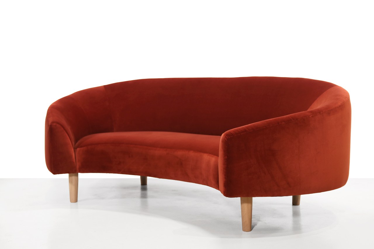 Omschrijving: Dit unieke vintage bankje brengt met zijn mooie ronde vormen elegantie in jouw interieur. Het is niet alleen een zitmeubel, maar ook een kunstwerk op zich. De gebogen vorm doet ons een beetje denken aan een croissant. Deze curved bank is bekleed met roestrood velours van 100% katoen wat een luxueuze uitstraling geeft en rust op ronde eikenhouten pootjes. Wees er snel bij, want dit unieke stuk is een zeldzame vondst! Wij hebben maar een exemplaar beschikbaar. Deze bank is 190 cm breed, 100 cm diep en 75 cm hoog. De zithoogte van de bank is 40 cm.