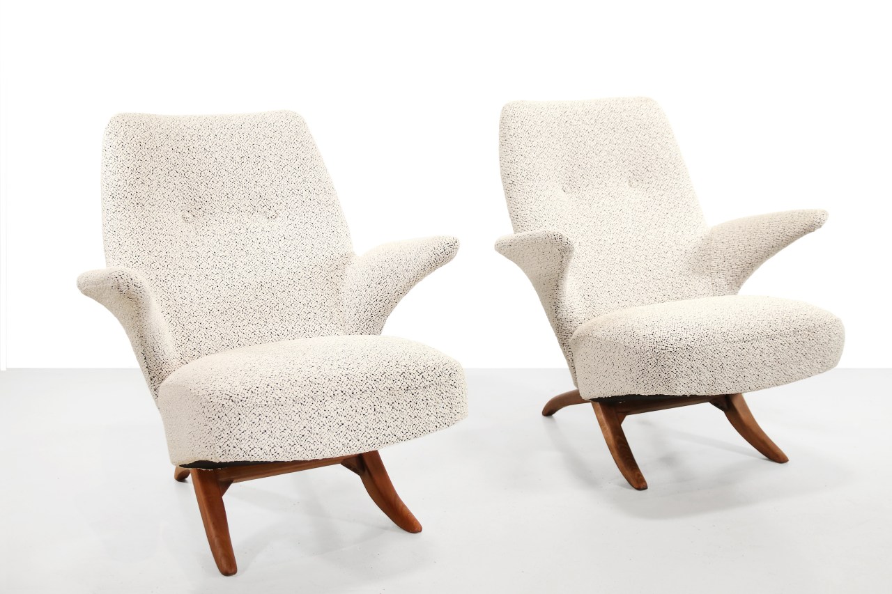 Omschrijving: Deze twee innovatieve mid century modern design fauteuils zijn in de jaren 50 door Theo Ruth ontworpen. De fauteuil heet Pinguïn en maakt gebruik van een techniek waarbij twee elementen in elkaar schuiven. Dit elegante en sculpturale meubelstuk, ook bekend als model 1003, is geproduceerd door Artifort. Met afmetingen van 81 cm in hoogte, 56 cm in diepte en 76 cm in breedte (met een zithoogte van 46 cm) biedt deze fauteuil niet alleen comfort, maar ook een iconisch designelement dat goed past in diverse interieurstijlen. De stoelen zijn vakkundig opnieuw gestoffeerd met een hoogwaardige meubelstof welke oorspronkelijk ook gebruikt werd door Artifort.