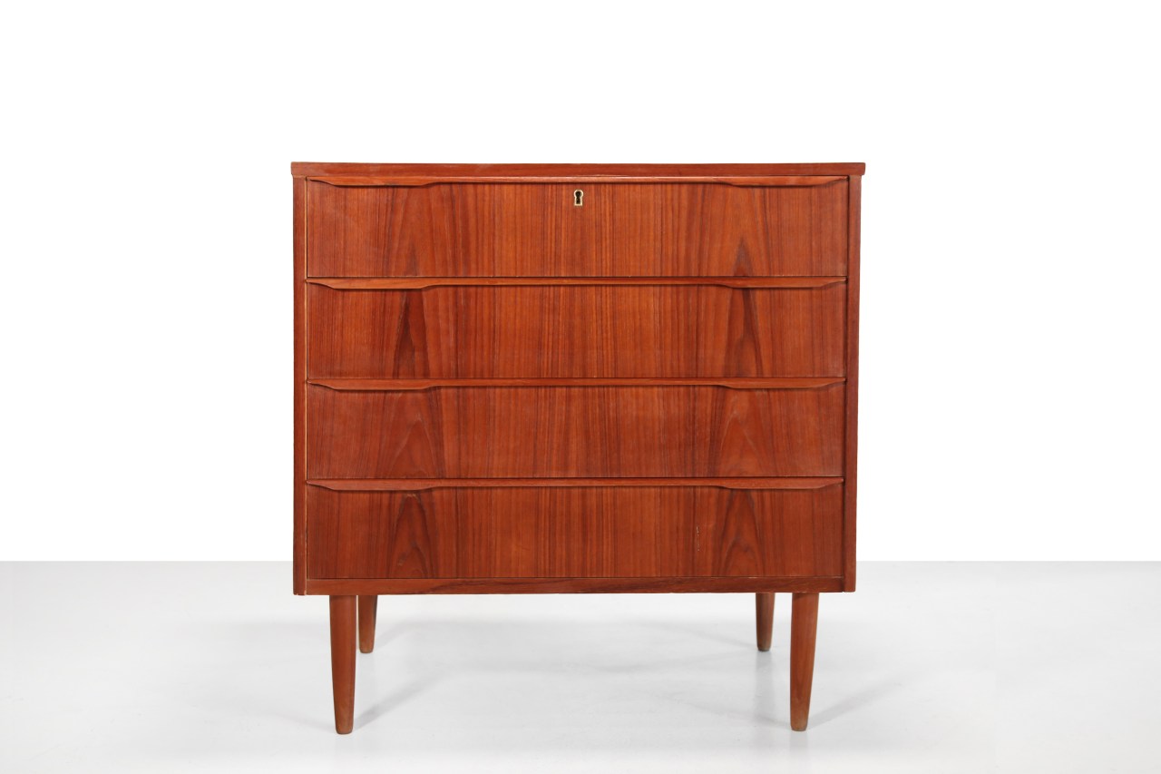 Omschrijving: Teak houten ladenkast uit Denemarken. Gemaakt van teak fineer en massief teak details met een minimalistische vormgeving. Dit kastje heeft vier lades en is te gebruiken op meerdere plekken in het huis. Gebruik het kastje bijvoorbeeld in de woonkamer of gang met een mooie plant of bos bloemen of om een kleine collectie tentoon te stellen, of bijvoorbeeld op de kinderkamer. Deze ladekast is 76 cm breed, 41 cm diep en 79 cm hoog.
