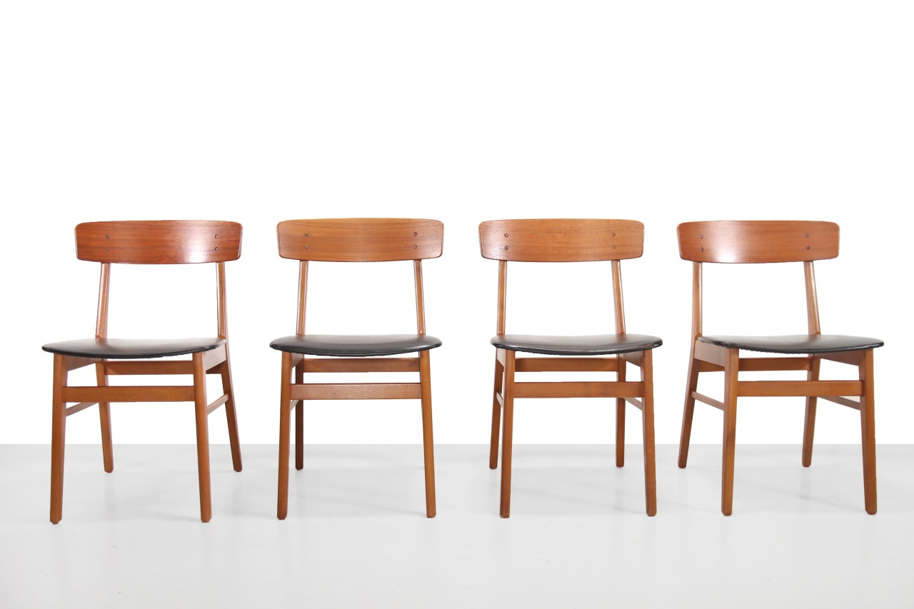 Omschrijving: Mooie set van 4 Farstrup eetkamerstoelen uit Denemarken. Deze luchtig vormgegeven stoelen uit Denemarken zijn gemaakt van massief beukenhout en teak plywood rugleuning. De zittingen zijn gestoffeerd in de originele zwarte skai, wat nepleder is. Dit is zeer handig schoon te maken en dus makkelijk in onderhoud. Tijdloze set stoelen geschikt voor elk interieur. De stoelen zijn 78 cm hoog, 45 cm breed en 47 cm diep. De zithoogte is 45 cm.
