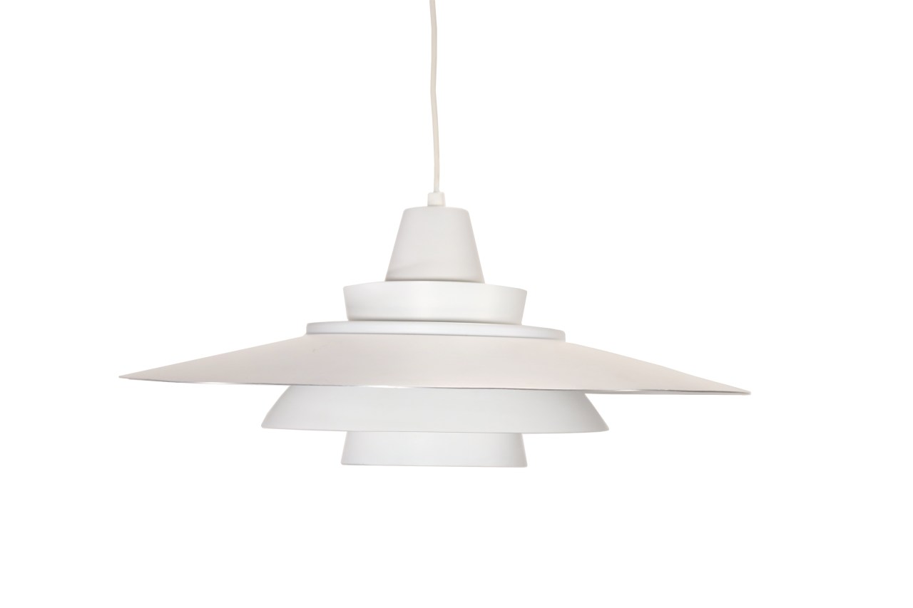 Omschrijving: Witte vintage Deens design hanglamp in de stijl van Poul Henningsen en Louis Poulsen. Dit model heeft vier lagen, is 24 cm hoog en heeft een diameter van 53 cm.