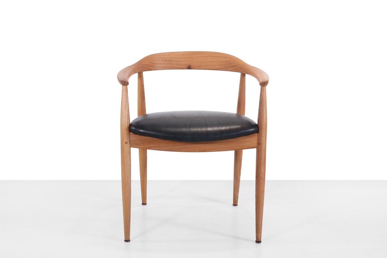 Omschrijving: Deze prachtige vormgegeven stoel gemaakt van massief iepenhout is ontworpen door Illum Wikkelso. Je ziet ook duidelijk zijn handtekening erin terug met de mooie ronde glooiende lijnen. De stoel is geproduceerd door Niels Eilersen in Denemarken in het eind van de jaren 50 . De stoel is gestoffeerd in zwart leer. De stoel heeft een zithoogte van 46 cm, en is in totaal 74 cm hoog, 62 cm breed en 45 cm diep. Heel fijn als je een hogere fauteuil zoekt voor in de woonkamer, of bijvoorbeeld als kantoorstoel aan je bureau.