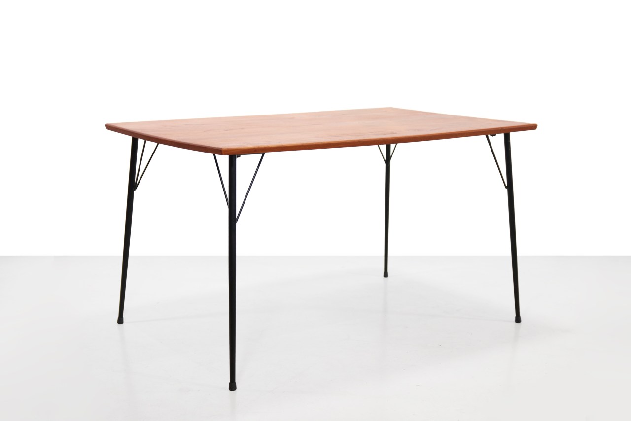 Omschrijving: Prachtige teakhouten tafel met een zogenoemd surfboard shape blad op vier zwart metalen poten. Het ontwerp heeft veel weg van de tafels die Arne Jacobsen en Borge Mogensen ook ontworpen hebben in die tijd. Deze tafel is een prachtige match met eetkamerstoelen die ook metalen pootjes hebben. Uiteraard kan deze tafel ook gebruikt worden als bureau. De tafel is 125 cm breed, 85 cm diep en 70 cm hoog.