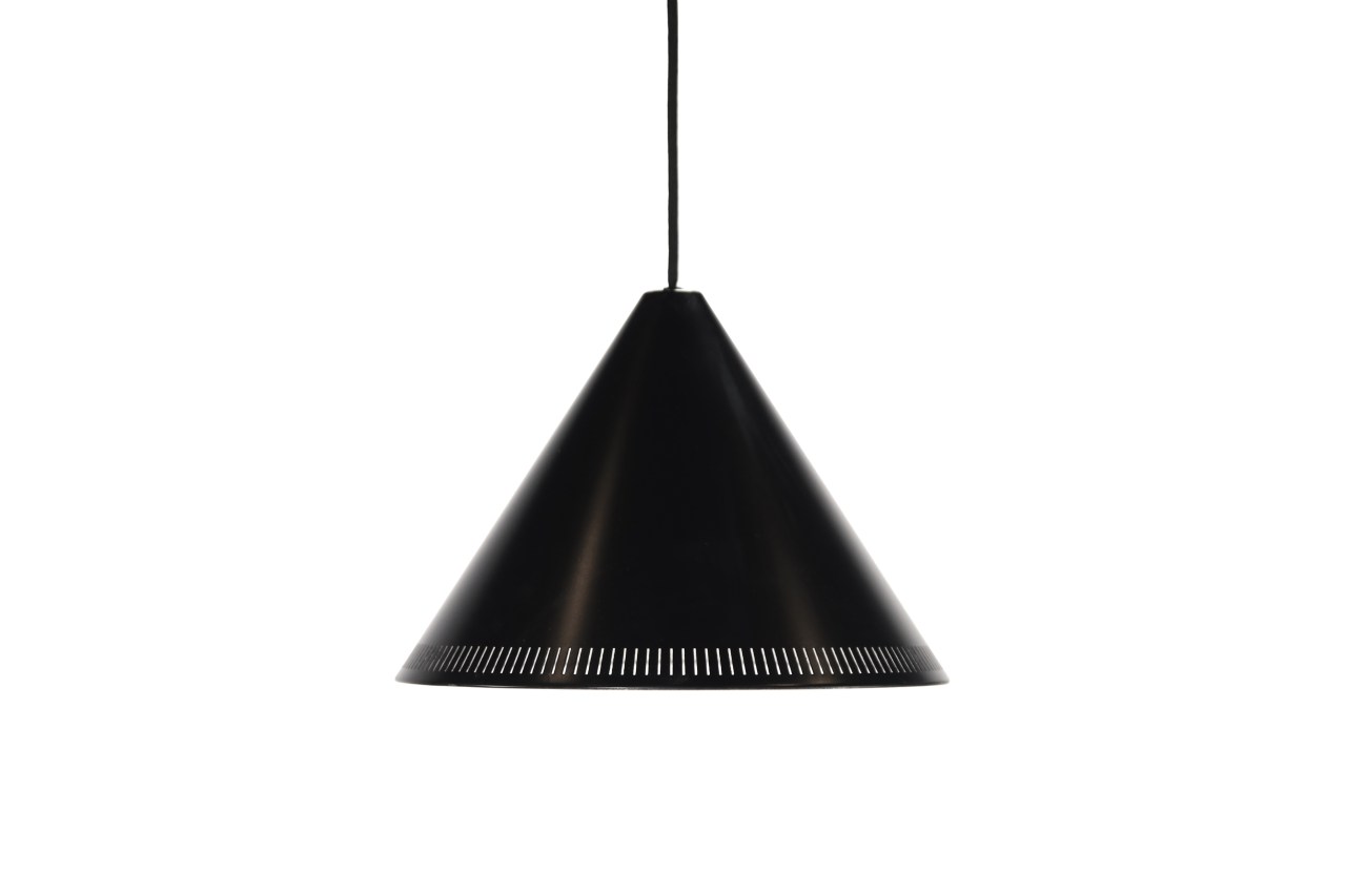 Omschrijving: Mooie minimalistische kegelvorm hanglamp geproduceerd door Lyfa in de jaren 70 in Denemarken. Toepasselijk aan de vorm wordt deze lamp model: Kegle genoemd. De lamp heeft geperforeerde streepjes in de kap wat een mooi lichteffect geeft. De lamp heeft een E27 fitting welke geschikt is voor LED lampen. De lamp is voorzien van een nieuw zwart stoffen snoer. De lamp is ongeveer 22 cm hoog en heeft een diameter van 30 cm.
