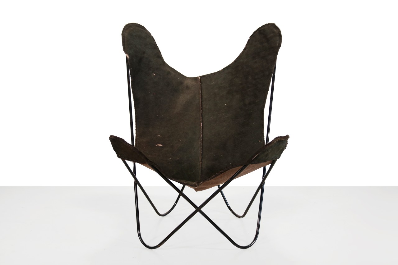 Omschrijving: Deze vlinderstoel is ontworpen door Jorge Ferrari Hardoy, Antonio Bonet & Juan Kurchan in 1938, maar geproduceerd in de jaren 70. Het is gemaakt van een zwart metalen frame met leren zitting van groen koeienhuid. Deze iconische stoel werd eigenlijk de BKF stoel genoemd, maar kreeg door zijn vormgeving al snel de naam Butterfly. Het metalen frame kan niet gedemonteerd worden. De stoel is 98 cm hoog, 81 cm breed en 70 cm diep.
