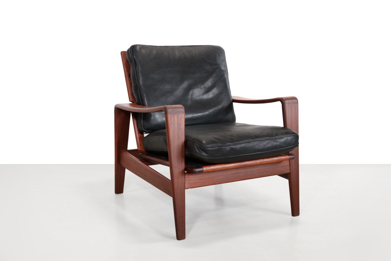 Omschrijving: Mooi organisch vormgegeven fauteuil ontworpen door Arne Wahl Iversen voor Komfort, Denemarken. Het frame is gemaakt van massief teak en de kussens van zwart leer. De kussens zijn gevuld met dons wat heerlijke comfortabel zit. Deze typische mid century modern design fauteuil is met zijn mooie ronde vormen een echte blikvanger. De fauteuil is 70 cm breed, 80 cm diep en 78 cm hoog.