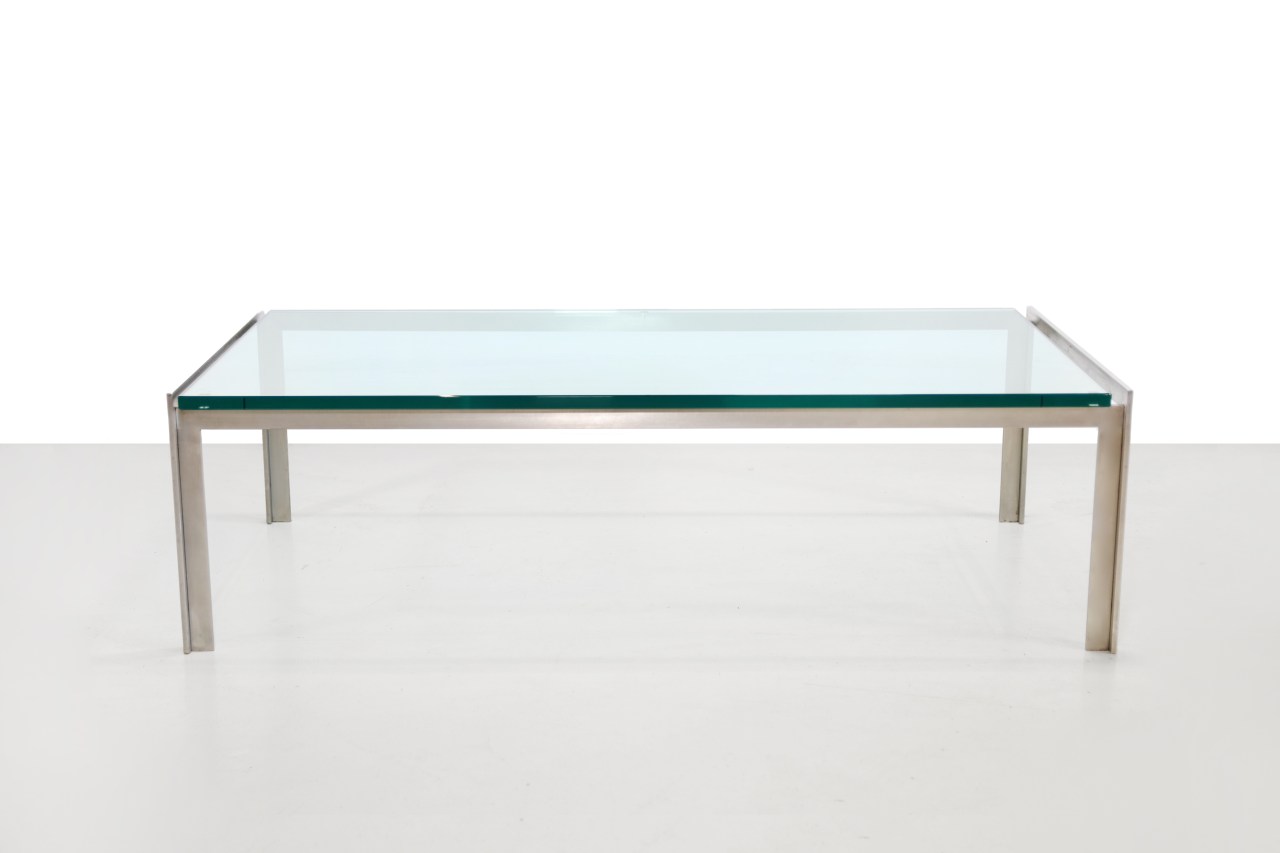 Omschrijving: Minimalistische en moderne glazen salontafel met RVS frame en een dik glazen blad van wel bijna 2 cm dikte. Behoorlijk hufterproof dus. De tafel is in de jaren 80 ontworpen door Hank Kwint en geproduceerd door Metaform, uit Nederland. Het ontwerp van de tafel borduurt voort op de Dutch Modernist ontwerpen van Martin Visser of bijvoorbeeld internationale ontwerpen van Poul Kjaerholm of Florence Knoll, maar speelt in het minimalisme toch door details toe te voegen waarbij de poten kruislings geplaatst zijn en door open ruimtes te laten waardoor onderdelen lijken te zweven. Het glazen blad blijft goed op zijn plek liggen door 6 rubbertjes die tussen het frame en het glas bevestigd zijn. Het mooie aan glazen salontafels is dat ze niet veel ruimte in lijken te nemen doordat je er doorheen kunt kijken. Hierdoor kan je bijvoorbeeld ook nog steeds genieten van je mooie vloerkleed. De tafel is 125 bij 60 cm en heeft een hoogte van 36 cm.