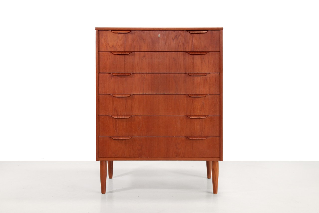 Omschrijving: Vintage Deens design ladenkast met 6 lades. Uitgevoerd in teak fineer en plywood greepjes. De prachtig vormgegeven greepjes stelen de show aan deze kast. Dit formaat is uiterst geschikt in de slaapkamer voor het opbergen van ondergoed en sokken. Maar zal ook zeker niet misstaan in de woonkamer, of in de hal. Het kan zelfs ook gebruikt worden als commode. De kast is 106 cm hoog, 82 cm breed en 44 cm diep.