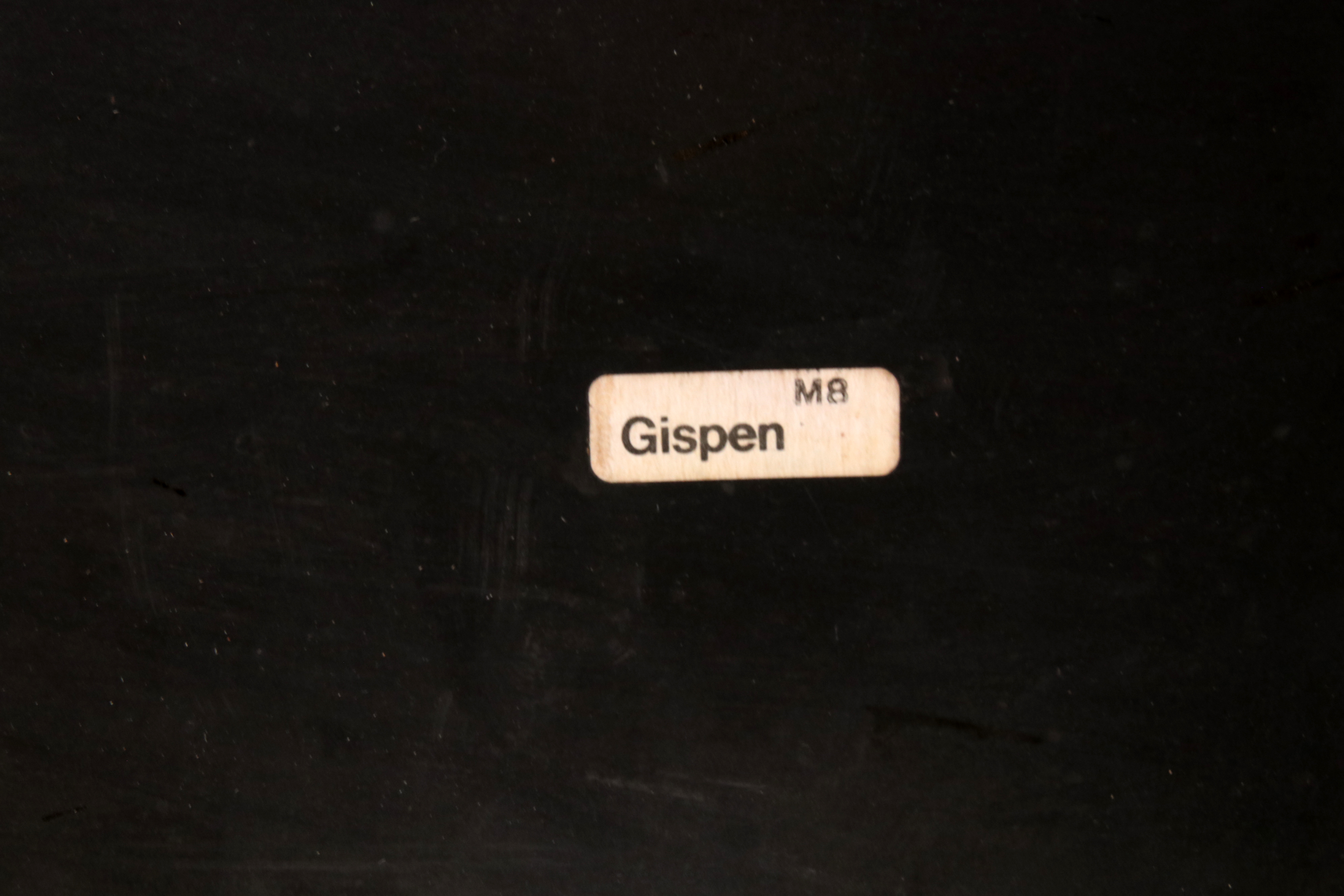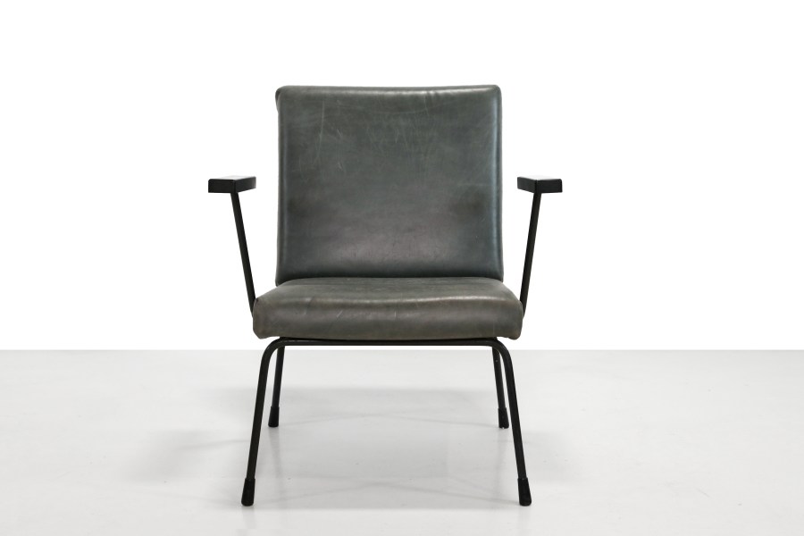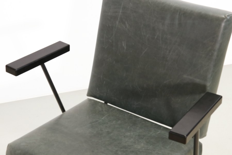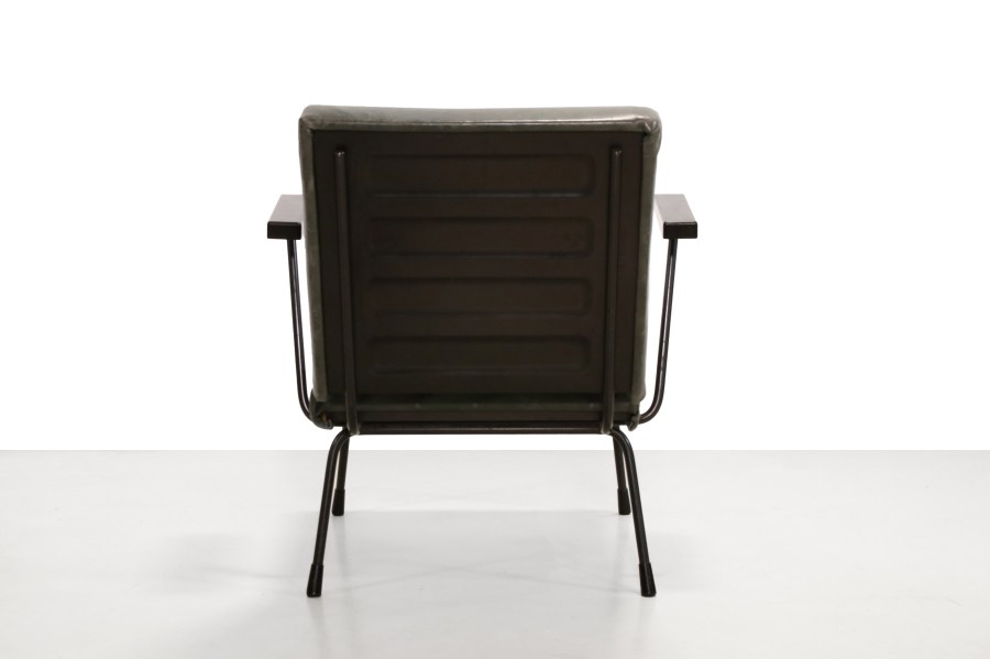 Omschrijving: Nederlands Modernistische design fauteuil ontworpen door Wim Rietveld en geproduceerd door Gispen. Deze fauteuil heeft een frame van zwart gelakt staal. De rug en de zitting zijn beide van gelakt plaatstaal en voorzien van een bekleding van groen leer met een prachtige patina.
