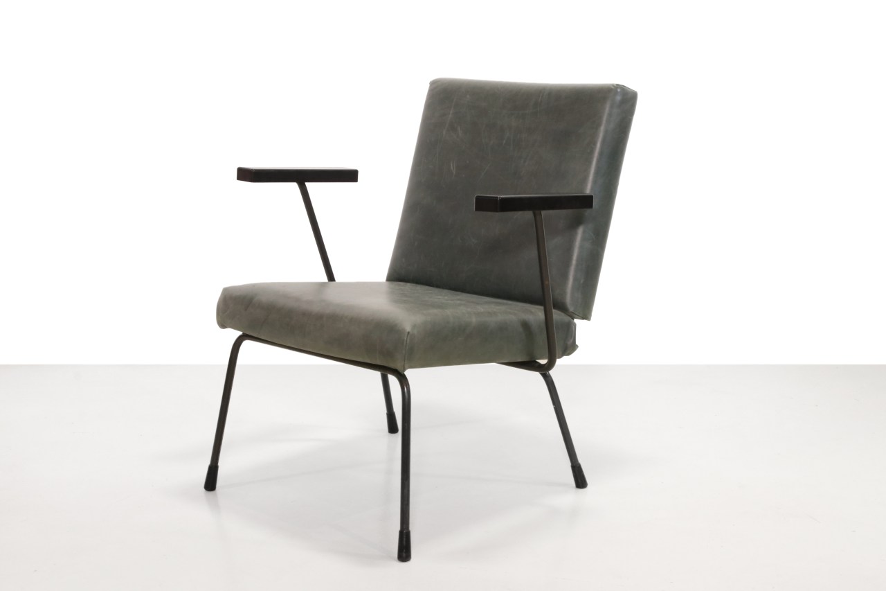 Omschrijving: Nederlands Modernistische design fauteuil ontworpen door Wim Rietveld en geproduceerd door Gispen. Deze fauteuil heeft een frame van zwart gelakt staal. De rug en de zitting zijn beide van gelakt plaatstaal en voorzien van een bekleding van groen leer met een prachtige patina.