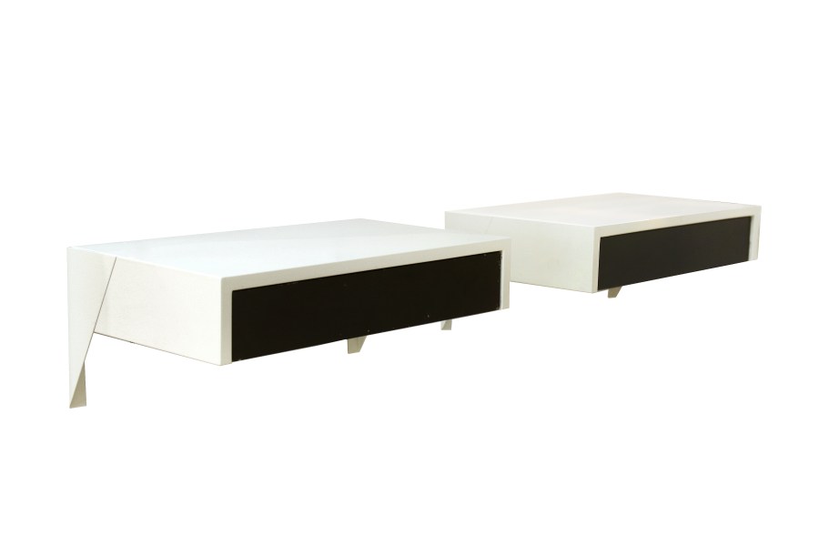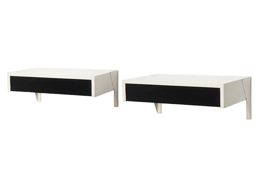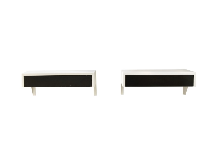 Omschrijving: Unieke set van twee wandkasten met lades, ontworpen door Martin Visser voor ’t Spectrum. Het model van deze kastjes heet DD01 en komen uit de tweede helft van de jaren 50. De kastjes kunnen eenvoudig blind aan de muur bevestigd worden door middel van twee schroeven per kast. De kasten zijn gemaakt van wit gelakt metaal met zwart gelakte houten lades. Een van de twee lades heeft een glazen shot om het vak in tweeën te delen. Deze kasten kunnen gebruikt worden als nachtkastjes, als gangtafel, of als minimalistisch wand opbergsysteem. Elk kastje is 50 cm breed, 30 cm diep en 10 cm hoog.