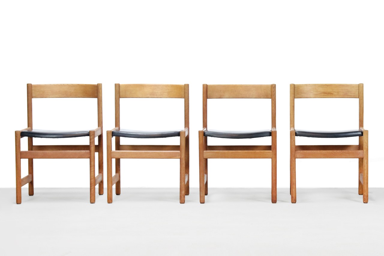 Omschrijving: Prachtige set van vier massief eiken eetkamerstoelen van de Triva serie, ontworpen door Yngvar Sandstrom uit Zweden in de tweede helft van de 20e eeuw. De zittingen zijn gestoffeerd in een zwart faux lederen bekleding, welke zeer goed schoon te houden is. Het houtwerk van de stoelen is grondig schoongemaakt en voorzien van een nieuwe laag olie. De stoelen hebben een prachtige simplistische shaker vormgeving, waarbij alle onnodige versieringen zijn weggelaten.