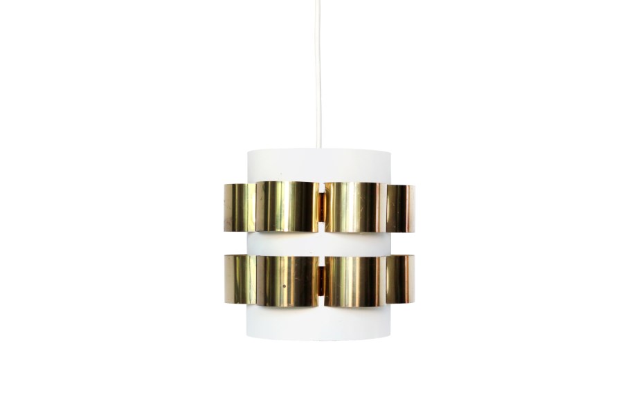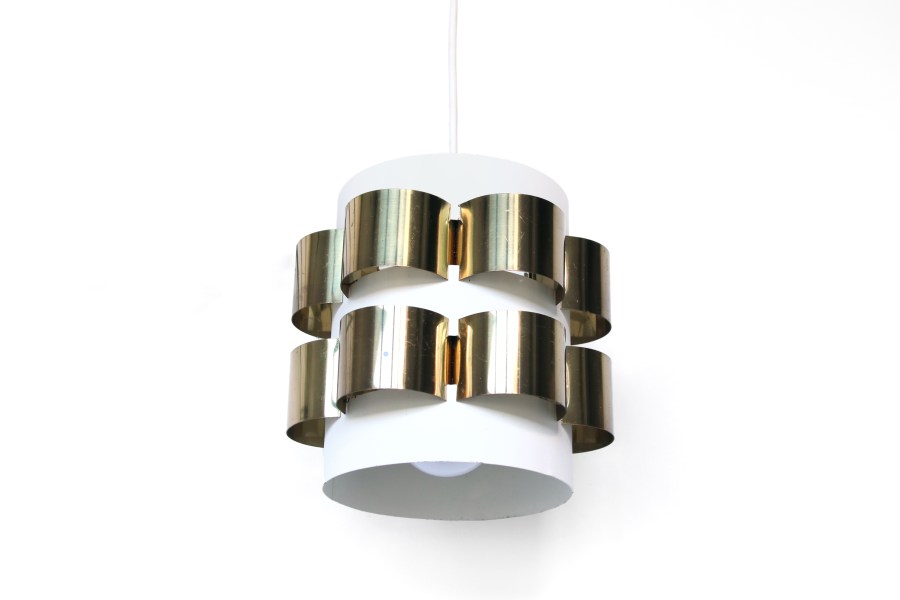 Omschrijving: Leuke lamp met messing details ontworpen door Werner Schou en geproduceerd door Coronell Denmark. Deze lamp is gemaakt van massief messing boogjes op een off white gelakte cylinder. Deze manier van “weven”, zorgt voor een mooie verspreiding van het licht en een prachtige bloemvormige vormgeving. Deze lamp vind je niet vaak en is daarom ook gewild onder de vintage verzamelaars. Deze decoratieve lamp is 18 cm hoog en heeft een diameter van 18 cm.