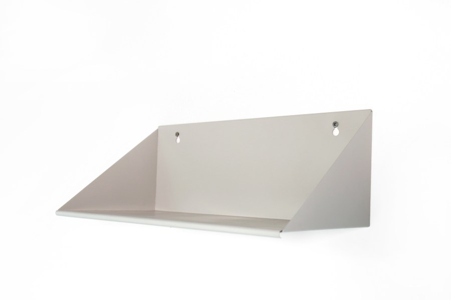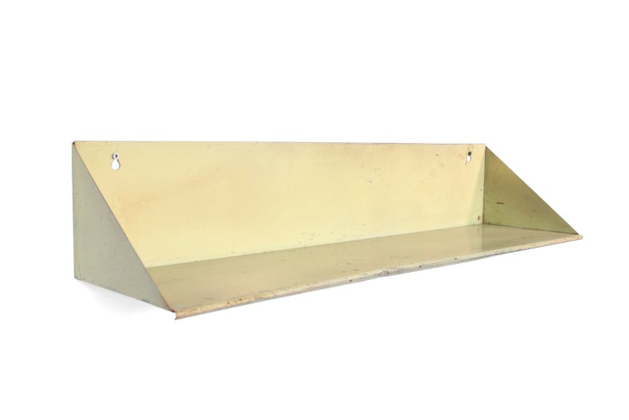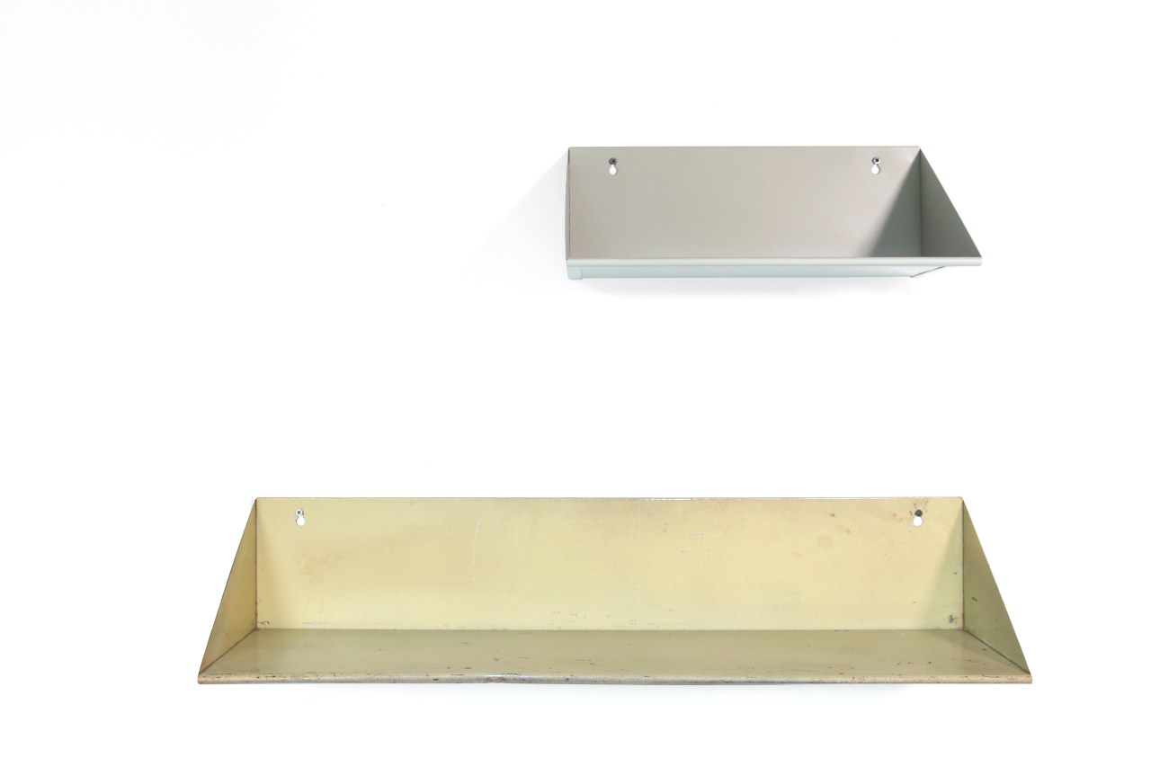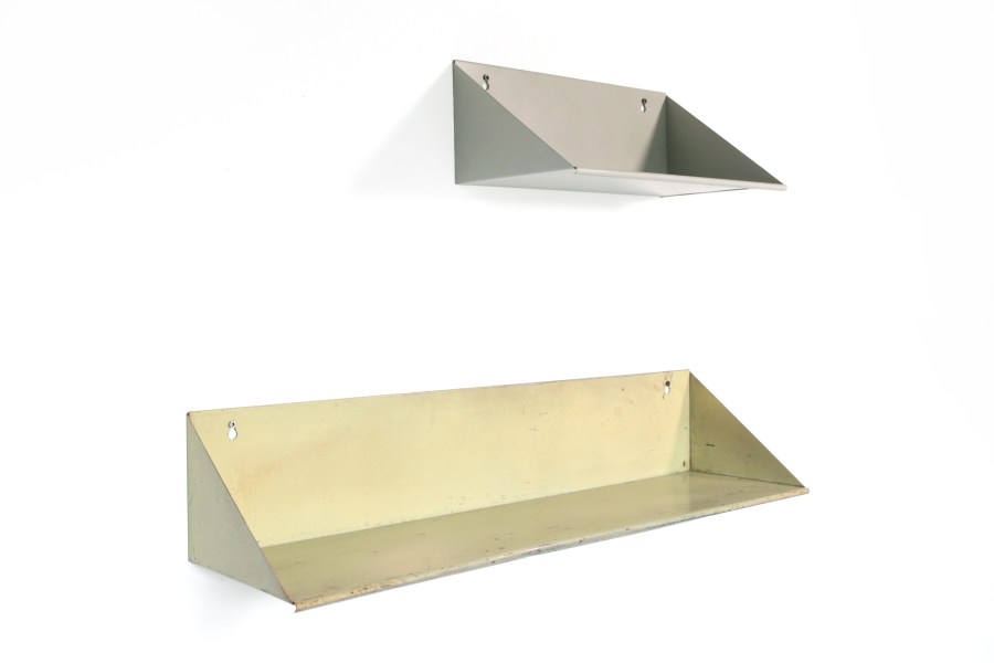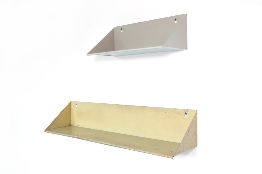 Deze plank maakte deel uit van deze tentoonstelling die Constant samen met Gerrit Rietveld vormgaf. Het is behoorlijk zeldzaam om er een te vinden, laat staan twee. We hebben een grote versie van 80 cm in geel die nog zijn originele lak heeft, maar waarop wel gebruikssporen te zien zijn. Wij hebben ook een wat kleiner model in grijs, van 41 cm breed, die een keer overgespoten is maar waardoor hij nog wel in een zeer goede staat is.