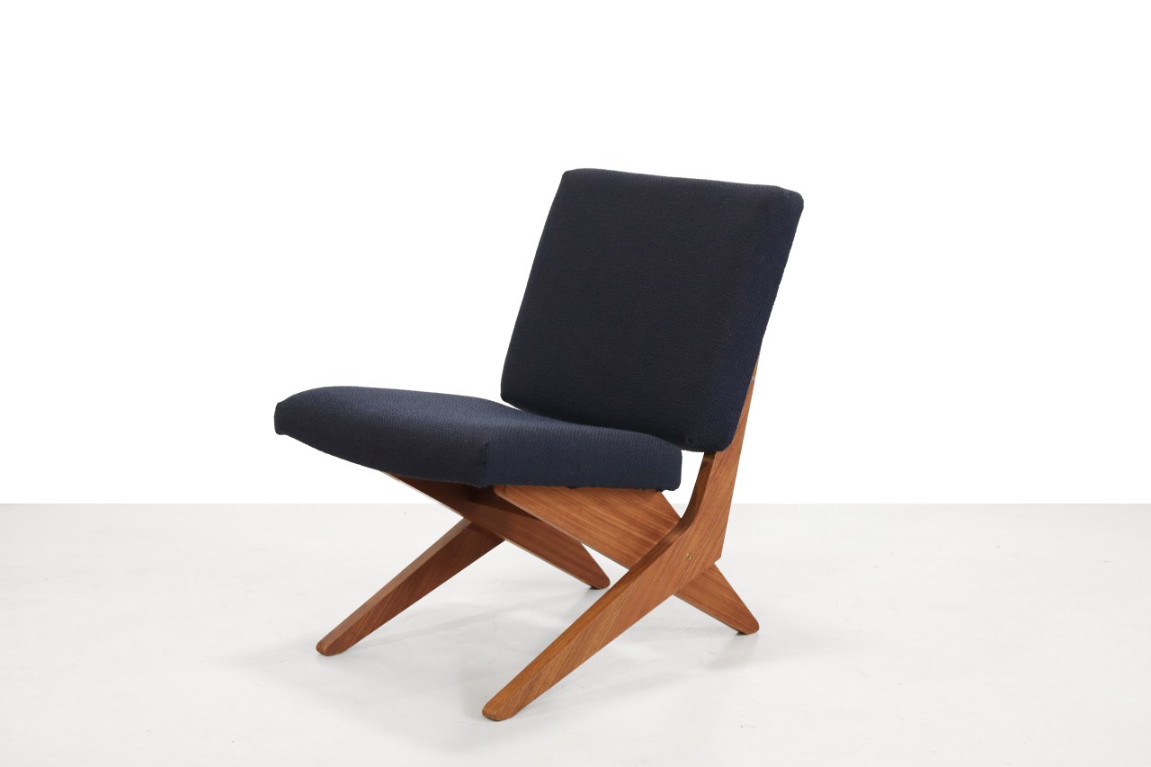 Omschrijving: Zeldzame teak gefineerde fauteuil van Jan van Grunsven voor Pastoe. De stoel heet eigenlijk FB18, maar is omgedoopt tot de Scissor chair vanwege de vorm van het frame. De fauteuil heeft een mooie kwaliteit meubelstof met een grof geweven motief in donkerblauw. De stoel is 46 cm breed bij 60 cm diep ben 70 cm hoog. De stoel heeft een zithoogte van 40 cm.