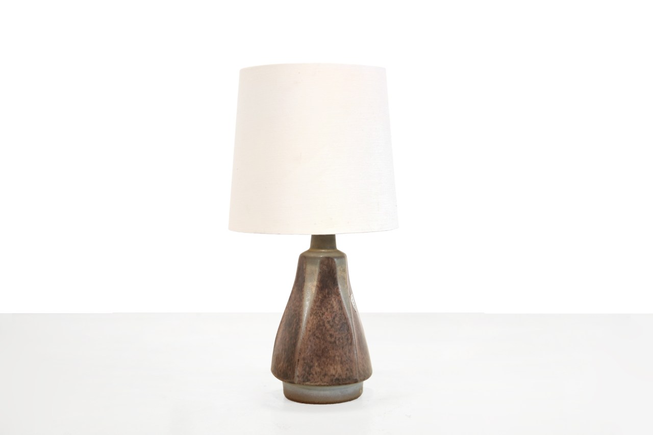 Omschrijving: Mooie Deens design tafellamp van keramiek met stoffen kap. Ontworpen door Marianne Starck voor Michael Andersen en geproduceerd door Bornholm. De voet is grijs bruin en licht blauw geglazuurd.