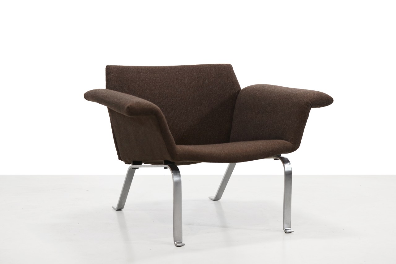 Omschrijving: Bijzondere fauteuil die gelijkenis vertoond met de ontwerpen van Poul Kjearholm of Hein Salomonson voor AP Polak. De stoel hebben wij al jaren in bezit om uit te zoeken wie deze geweldige fauteuil heeft ontworpen. Helaas is het ons niet gelukt om de informatie te achterhalen. We hebben hem opnieuw gestoffeerd in een hoge kwaliteit bruin wollen stof, exact hetzelfde als wat er op zat. Maar dan weer nieuw en voorzien van nieuw schuim. Het is een grote zware easy chair die heerlijk zit. De stoel is 93 cm breed x 70 cm diep x 67 cm hoog en heeft een zithoogte van 35 cm.