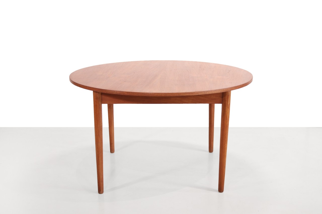 Omschrijving: Grote ronde eetkamertafel uit Denemarken uitgevoerd in teak. Deze tafel biedt ruim plaats voor vier personen. Het tafelblad heeft dan ook een diameter van 130 cm. Het gaat om een vast tafelblad die niet verlengbaar is. Hierdoor heb je ook geen storende lijnen in het blad. De tafel is 73 cm hoog en is een mooie combinatie met onze H.W Klein eetkamerstoelen die wij op dit moment te koop aanbieden.