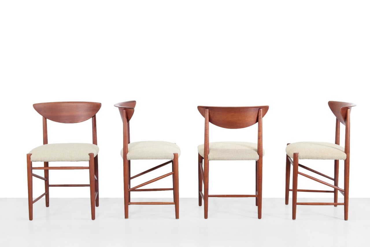 Omschrijving: Set van 6 teakhouten model 316 stoelen ontworpen door Peter Hvidt en Orla Molgaard Nielsen in 1955. De zittingen zijn opnieuw gestoffeerd in een natuurlijke meubelstof.