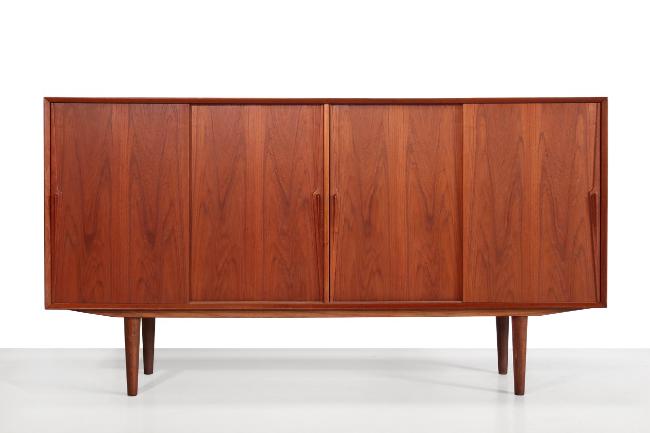 Omschrijving: Mid-century modern Deens design teak dressoir model nummer 19, ontworpen door Gunni Omann voor Omann Juns Møbelfabrik in Denemarken. Dit dressoir is geproduceerd in de jaren 60 en is dus echt een vintage stuk. Dit prachtig vormgegeven dressoir heeft 4 schuifdeuren met prachtige organische handgrepen met achter de linker schuifdeur 4 lades. Ook is deze highboard erg mooi aan de achterkant afgewerkt dus hij zou ook prima in het midden van de ruimte kunnen staan. Dit sideboard is 200 cm breed, 42 cm diep en 106 cm hoog.