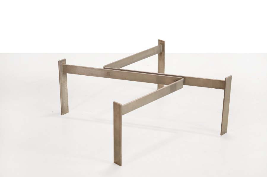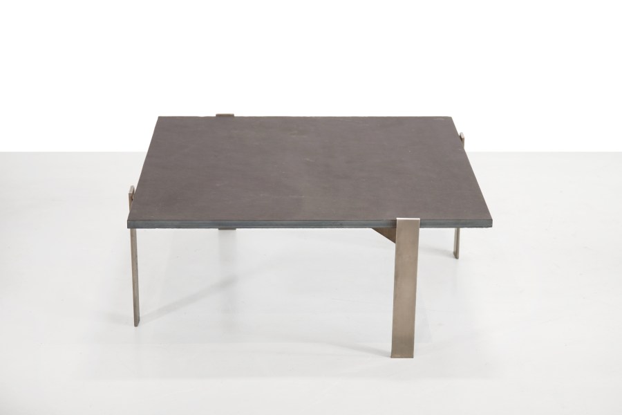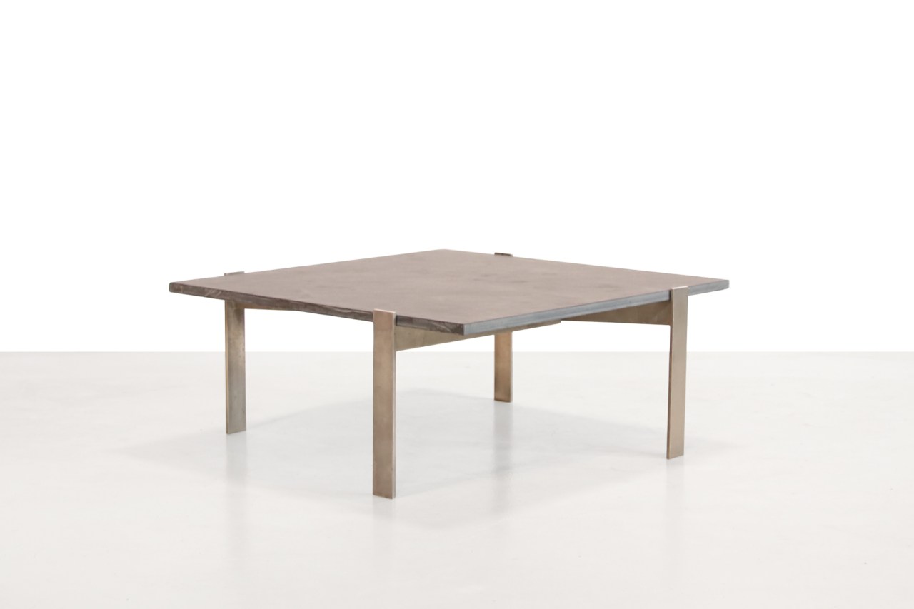 Omschrijving: Zeer zeldzame salontafel van Rob Parry vervaardigd door Stabin Bennis uit Nederland. De tafel is gemaakt van vernikkeld staal en een leistenen blad. De salontafel is alleen te vinden in naslagwerk. De tafel is zo zeldzaam dat er op internet weinig over bekend is. Wij hebben deze salontafel via een veilinghuis van de familie Parry zelf kunnen overkopen. Door het leistenen blad is de coffeetable erg vergelijkbaar met de salontafels van Poul Kjaerholm. Naast dat het een erg mooie salontafel is, is het ook een uniek stuk Nederlands design geschiedenis. Echt voor de liefhebber. De tafel is 80 cm bij 80 cm en is 33 cm hoog.