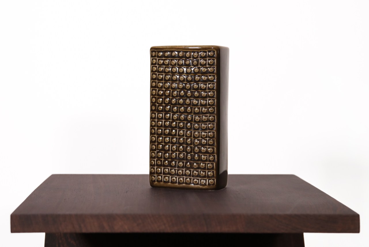 Omschrijving: Prachtige rechthoekige vaas, model 1, ontworpen door Gunnar Nylund (1904-1997) voor de Zweedse keramiek fabriek Rörstrand in de jaren 60. Deze vaas is donkerbruin geglazuurd en heeft een mooi reliëf bestaande uit een patroon van kleine uitstekende cirkels in diepliggende vierkantjes. Door de kleur en de constante herhaling in het reliëf is het een zeer moderne en tijdloze vaas, die ook zonder bloemen graag gezien wordt. De vaas is gemerkt aan de onderzijde. Deze bijzonder vaas is 18,5 cm hoog, 9,5 cm breed en 7 cm diep.