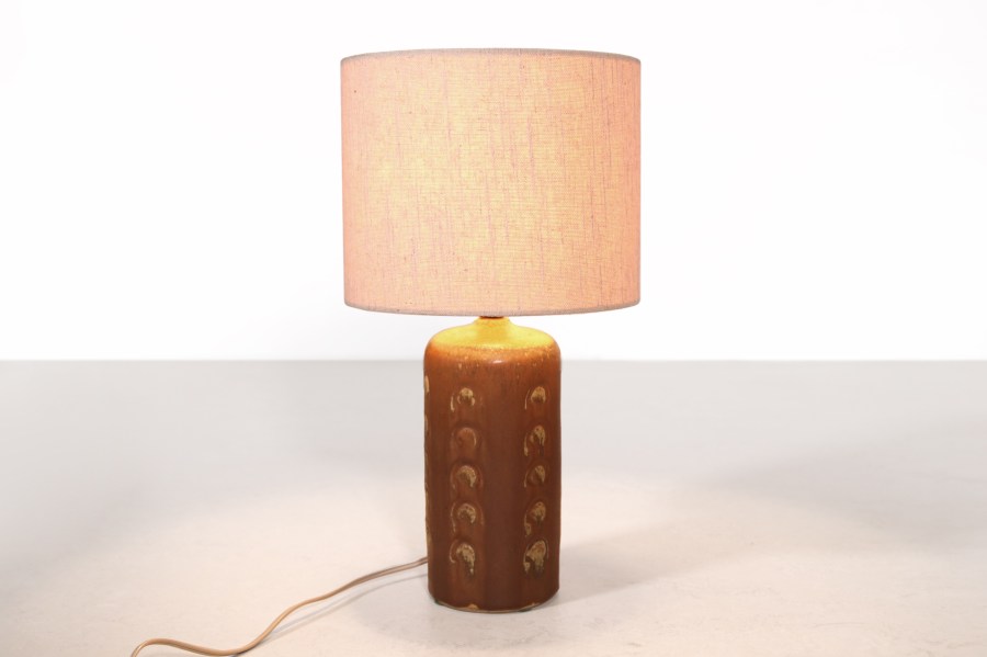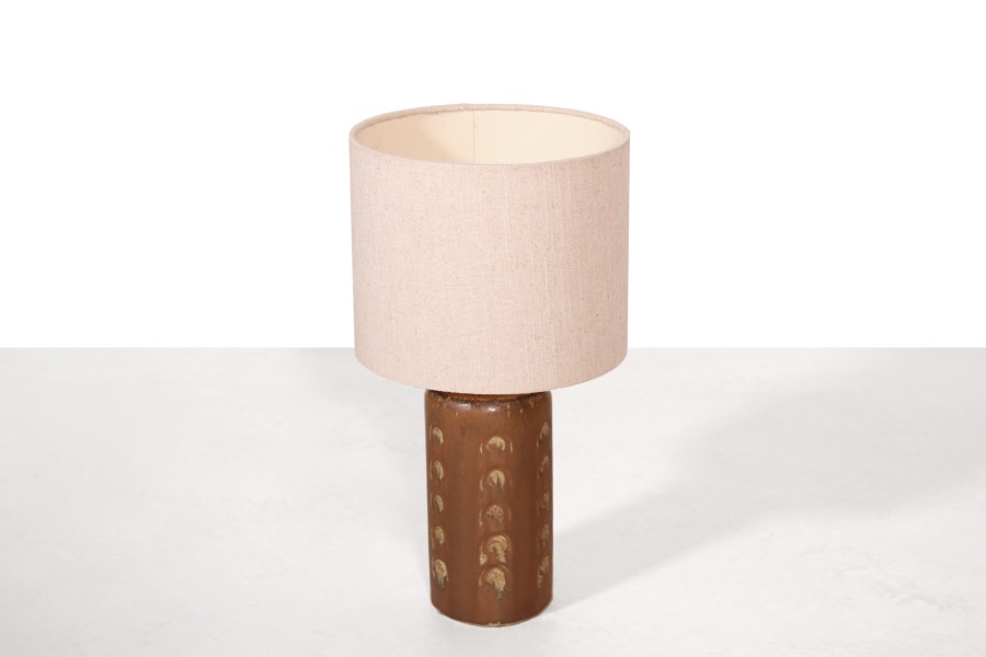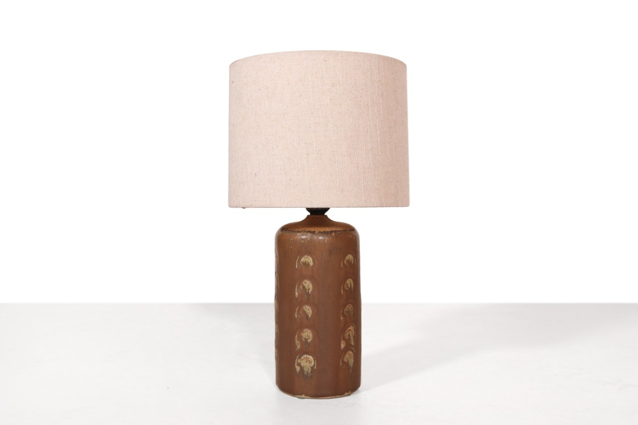 Omschrijving: Mooie Deense keramieken tafellamp met een natuurlijke roestrode voet met een reliëf van cirkels en een prachtige beige linnen kap. De lampenvoet is gemerkt door de ontwerper. De lamp is in totaal 42 cm hoog en de kap heeft een diameter van 22,5 cm.