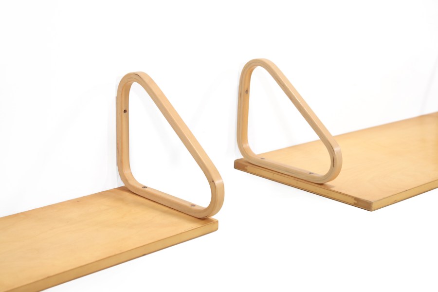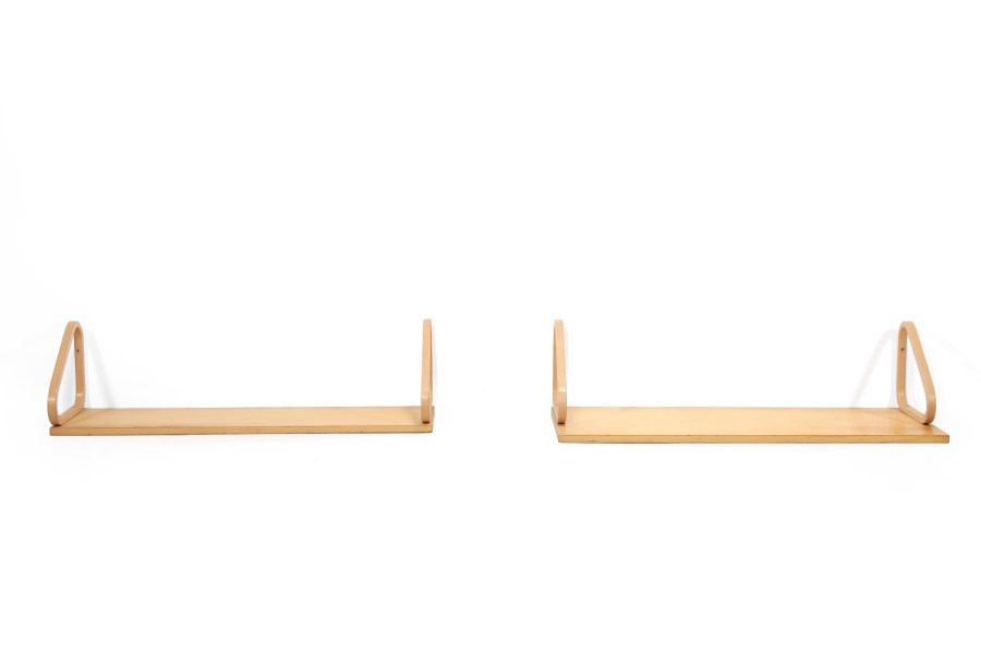 Omschrijving: Mooie set van twee wandplanken ontworpen door Alvar Aalto in 1936. Aalto ontwierp deze elegante en praktische boekenplanken van berken gefineerd hout en de iconische gebogen lamellen beugels. Deze set bestaat uit een model 112a en 112b waarbij de ene plank iets dieper is dan de ander.