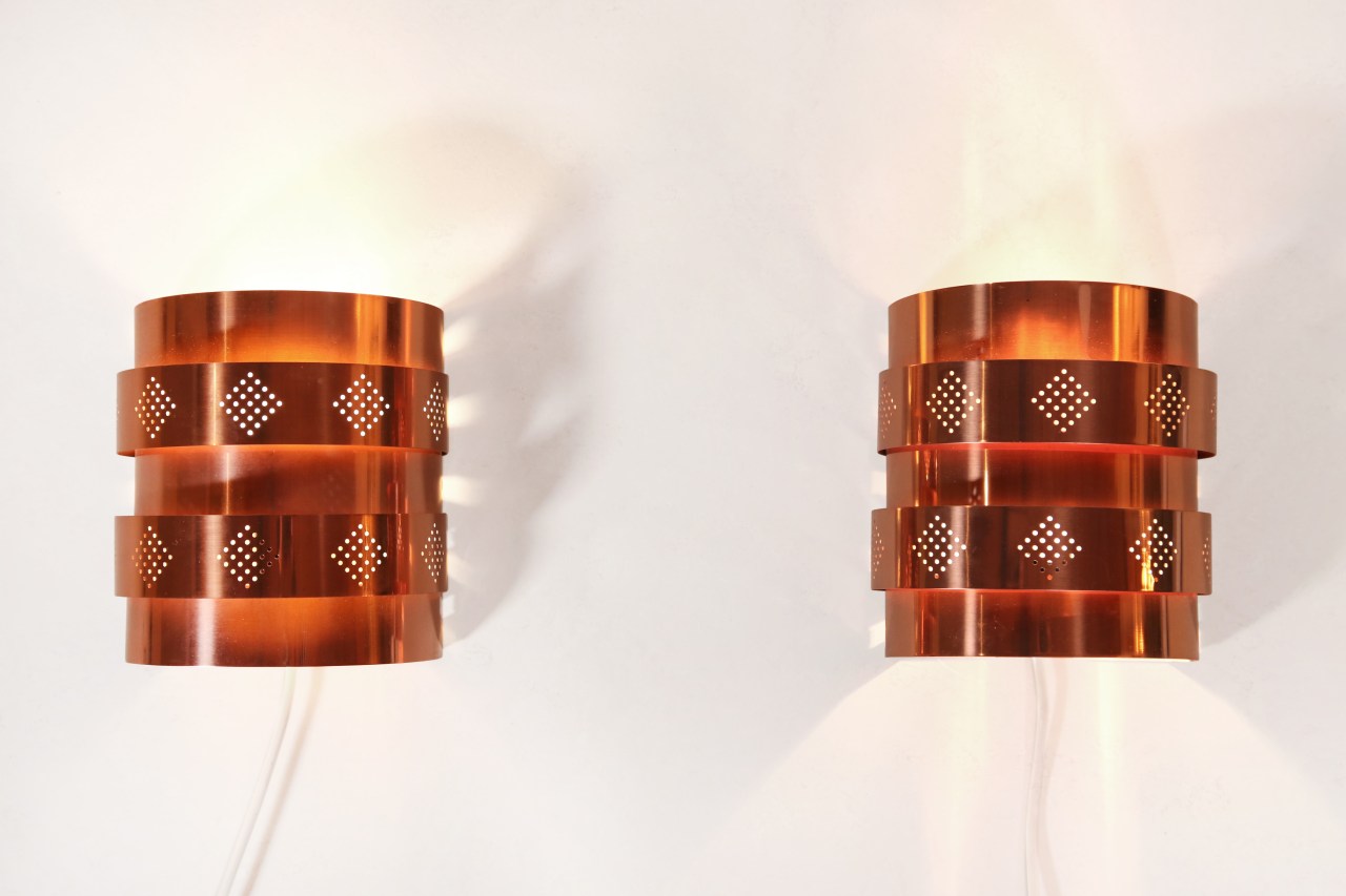 Omschrijving: Mooie set van twee koperen wandlampen ontworpen door Werner Schou in de jaren 60 in Denemarken. De lampen zijn een slim ontwerp gemaakt van koperen lamellen, waarvan twee geperforeerd zijn met een ruitmotief voor een speels effect. De lampen kunnen fungeren als wandlampen of bedlampjes. De lampen zijn voorzien van een sticker. De lampen zijn 19 cm hoog, 17 cm breed en 12 cm diep.