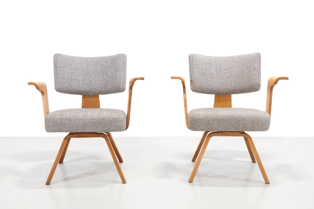 Staat: De stoelen zijn opnieuw gestoffeerd in wollen grijze gemêleerde meubelstof van Maharam by Kvadrat en verkeren in goede vintage staat.