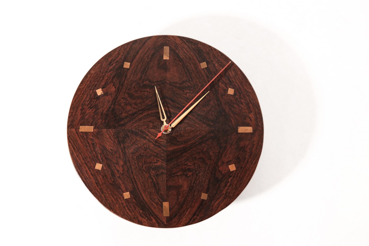 Omschrijving: Prachtige ronde klok gemaakt van Palissander hout fineer en ingezet met koper om de uren aan te geven. De klok heeft een elektrisch mechanisme waardoor je de klok op zou moeten hangen waar er idealiter een elektrische aansluiting in de muur bevindt. Er kan ook een draad aan bevestigd worden met een stekker. Als je dit liever niet hebt, en een beetje handig bent, is het ook mogelijk een nieuw uurwerk te monteren die op batterijen werkt. De klok heeft een diameter van 27 cm en een diepte van 4,5 cm.