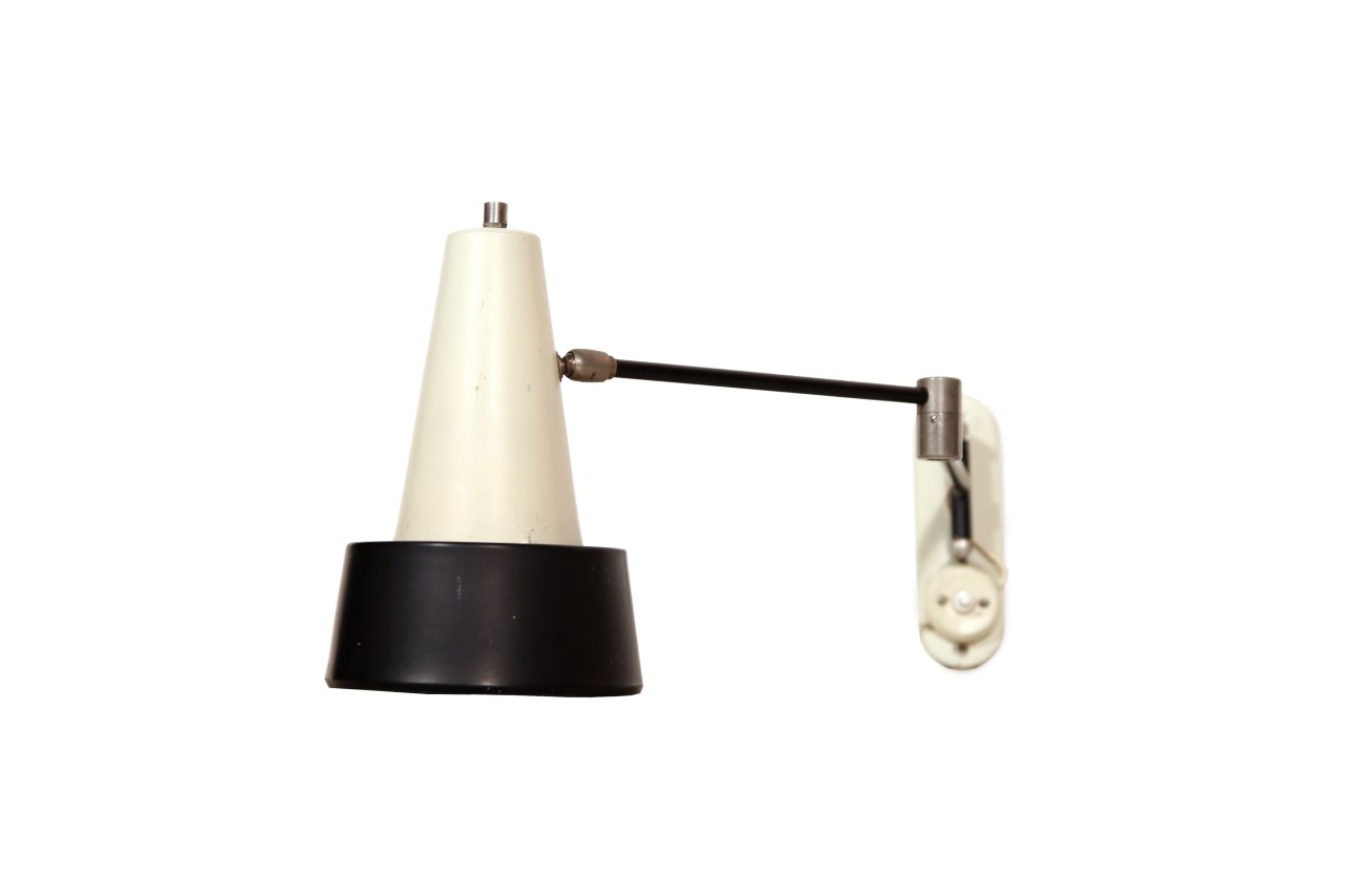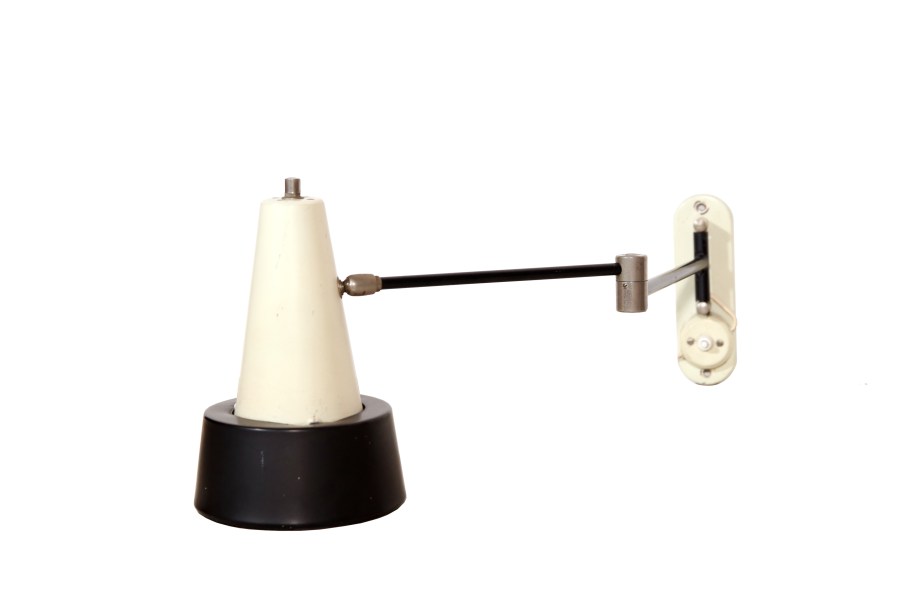 Omschrijving: Nederlands modernistische metalen wandlamp in zwart en wit gelakt metaal. Deze lamp kan aan de muur bevestigd worden en elke gewenste kant op gepositioneerd worden. Typisch jaren 60 Nederlands gedachtegoed waarbij alles op meerdere plekken gebruikt kon worden. De lamp is nog in de volledig originele staat met prachtige vale patina. Je ziet dat deze lamp al een eerder leven gehad heeft, maar is nog in goede staat voor zijn leeftijd.