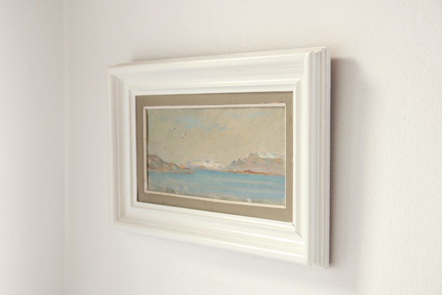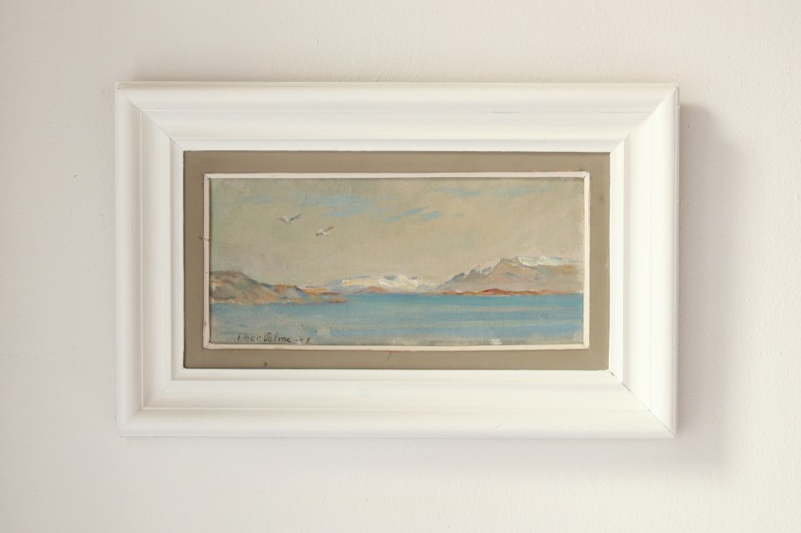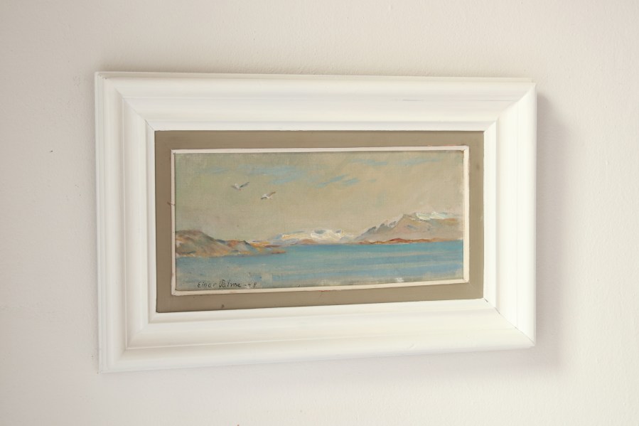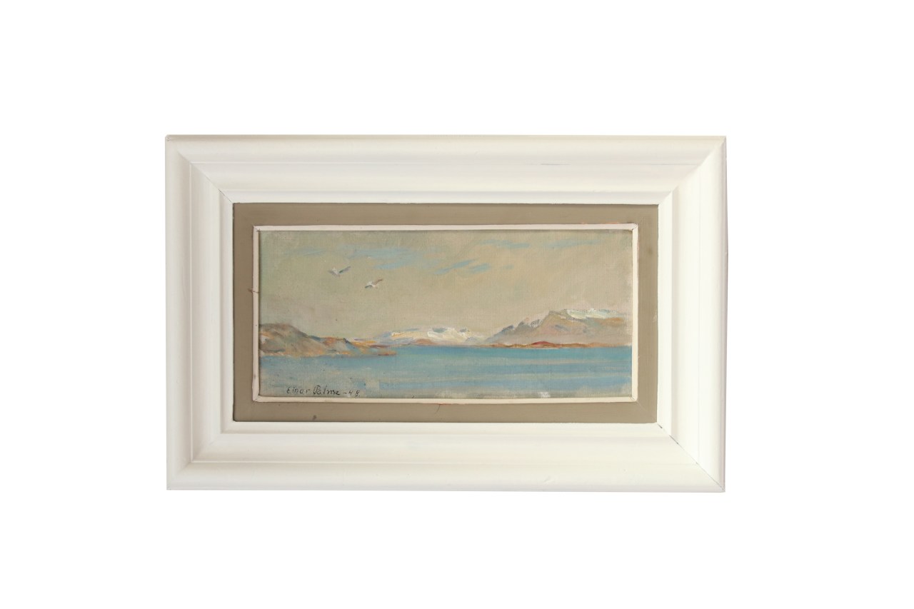 Omschrijving: Zeer mooi Zweeds olieverfschilderij van Einar Palme uit 1948. Het kunstwerk toont een heuvelachtig landschap aan het water met zeemeeuwen in prachtige blauw tinten. Het werk is gesigneerd. Dit schilderij is ingelijst in een houten lijst welke wit gelakt is en heeft een afmeting van 45 cm breed en 29 cm hoog.