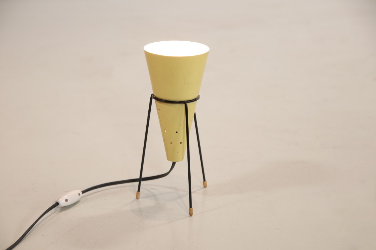 Omschrijving: Super leuk geel driepoot tafellampje. In de stijl van Stilux Milano, Svend Aage Holm-Sorensen of Hoogervorst voor Anvia. Waar het lampje precies vandaan komt weten we niet, maar gaaf is hij wel. Gemaakt van zwart en geel gelakt metaal. Het lampje schijnt voornamelijk omhoog wat perfect is voor een sfeer lichtje op een kast bijvoorbeeld.