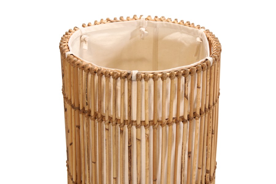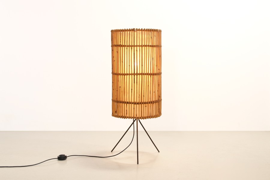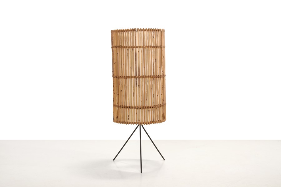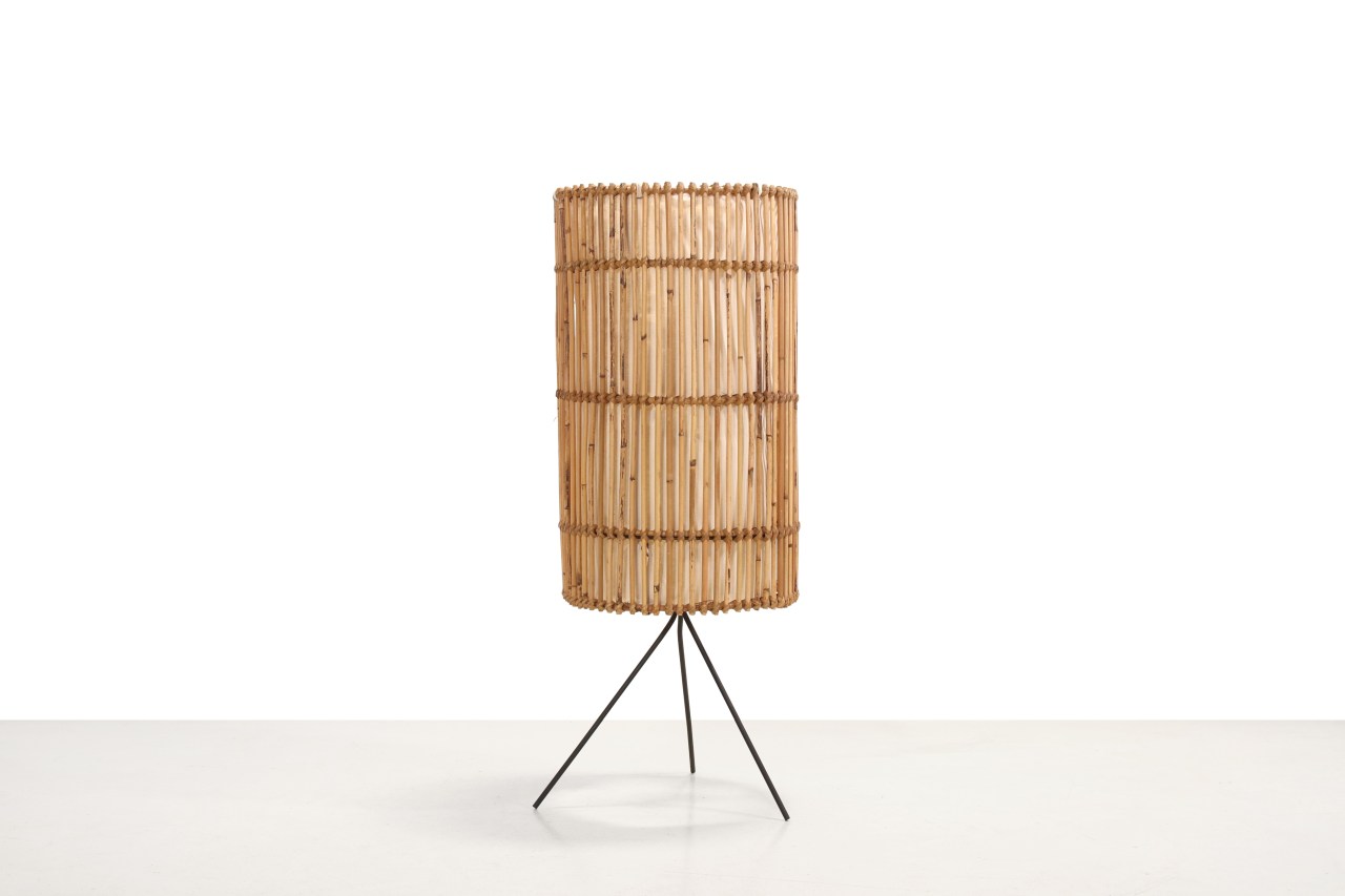 Omschrijving: Prachtige vloerlamp uit Frankrijk in de stijl van Louis Sognot. Gemaakt van Bamboe en rotan met een metalen driepoot voet en ongebleekt katoen.
