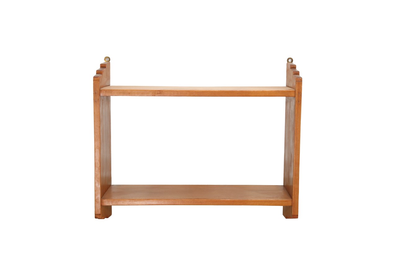 Omschrijving: Grenen jaren 30 modernistische wandplank. De plank heeft een leuk detail waarbij de zijkanten trapsgewijs toe en aflopen. De plank is 59 cm breed, 22 cm diep en 49 cm hoog.
