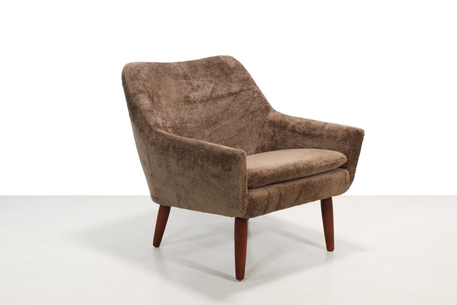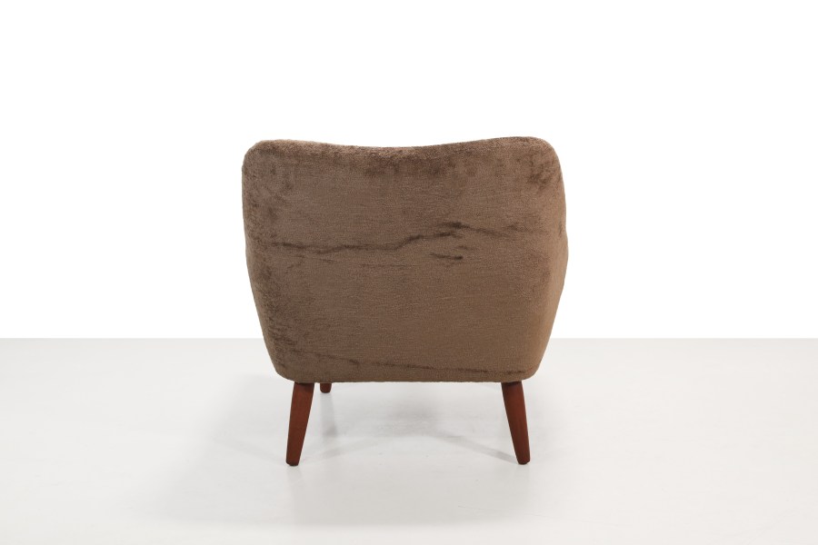 Omschrijving: Teak Deens design fauteuil met armleuningen en teakhouten pootjes in een luxe bruin grijze faux sheepskin stoffering. Wel de look van een huid, maar met een beter geweten.